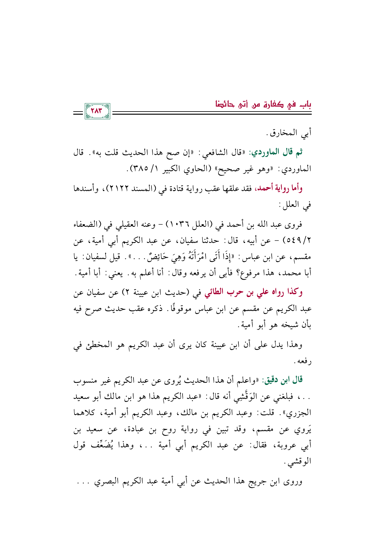 فروى عبد الله بن أحمد في (العلل ١٠٣٦) -وعنه العقيلي في (الضعفاء ٢/ ٥٤٩) - عن أبيه، قال: حدثنا سفيان، عن عبد الكريم أبي أمية، عن مقسم، عن ابن عباس: ((إِذَا أَتَى امْرَأَتَهُ وَهِيَ حَائِضٌ ... )). قيل لسفيان: يا أبا محمد، هذا مرفوع؟ فأبى أن يرفعه وقال: أنا أعلم به. يعني: أبا أمية.