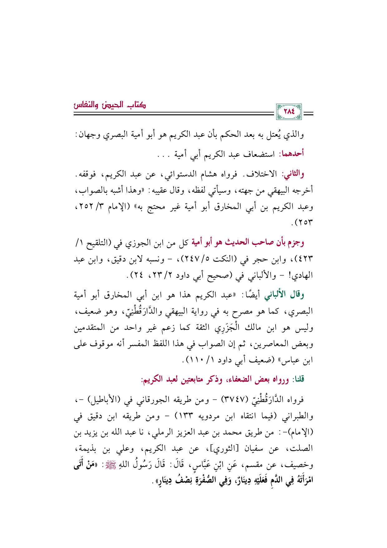 وقال الألباني أيضًا: ((عبد الكريم هذا هو ابن أبي المخارق أبو أمية البصري، كما هو مصرح به في رواية البيهقي والدَّارَقُطْنِيّ، وهو ضعيف، وليس هو ابن مالك الْجَزَرِي الثقة كما زعم غير واحد من المتقدمين وبعض المعاصرين، ثم إن الصواب في هذا اللفظ المفسر أنه موقوف على ابن عباس)) (ضعيف أبي داود ١/ ١١٠).