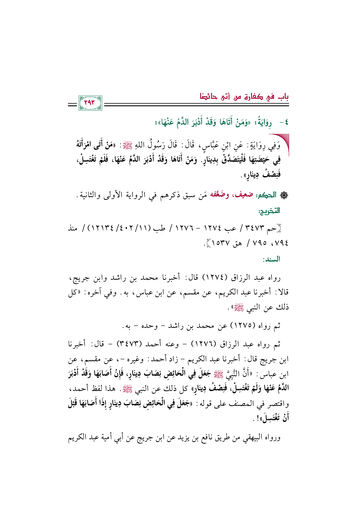 ثم رواه عبد الرزاق (١٢٧٦) - وعنه أحمد (٣٤٧٣) - قال: أخبرنا ابن جريج قال: أخبرنا عبد الكريم - زاد أحمد: وغيره -، عن مقسم، عن ابن عباس: ((أَنَّ النَّبِيَّ صَلَّى اللهُ عَلَيْهِ وَسَلَّمَ جَعَلَ فِي الْحَائِضِ نِصَابَ دِينَارٍ، فَإِنْ أَصَابَهَا وَقَدْ أَدْبَرَ الدَّمُ عَنْهَا وَلَمْ تَغْتَسِلْ، فَنِصْفُ دِينَارٍ)) كل ذلك عن النبي صلى الله عليه وسلم. هذا لفظ أحمد، واقتصر في المصنف على قوله: ((جَعَلَ فِي الْحَائِضِ نِصَابَ دِينَارٍ إِذَا أَصَابَهَا قَبْلَ أَنْ تَغْتَسِلَ))!.
