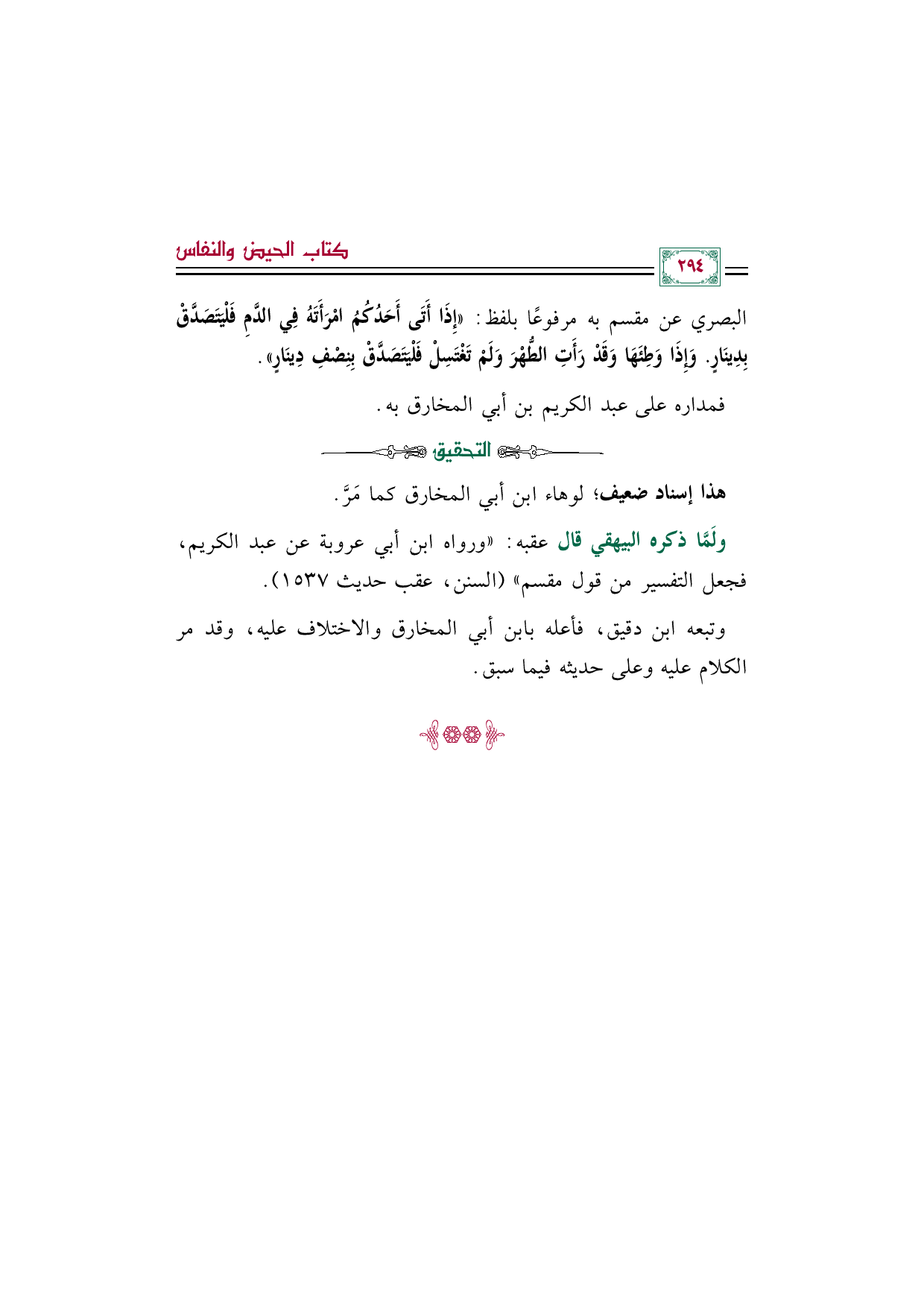 البصري عن مقسم به مرفوعًا بلفظ: ((إِذَا أَتَى أَحَدُكُمُ امْرَأَتَهُ فِي الدَّمِ فَلْيَتَصَدَّقْ بِدِينَارٍ. وَإِذَا وَطِئَهَا وَقَدْ رَأَتِ الطُّهْرَ وَلَمْ تَغْتَسِلْ فَلْيَتَصَدَّقْ بِنِصْفِ دِينَارٍ)).
