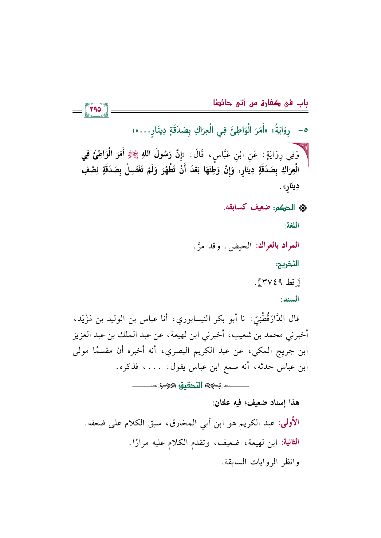 قال الدَّارَقُطْنِيّ: نا أبو بكر النيسابوري، أنا عباس بن الوليد بن مَزْيَد، أخبرني محمد بن شعيب، أخبرني ابن لهيعة، عن عبد الملك بن عبد العزيز بن جريج المكي، عن عبد الكريم البصري، أنه أخبره أن مقسمًا مولى ابن عباس حدثه، أنه سمع ابن عباس يقول: ... ، فذكره.