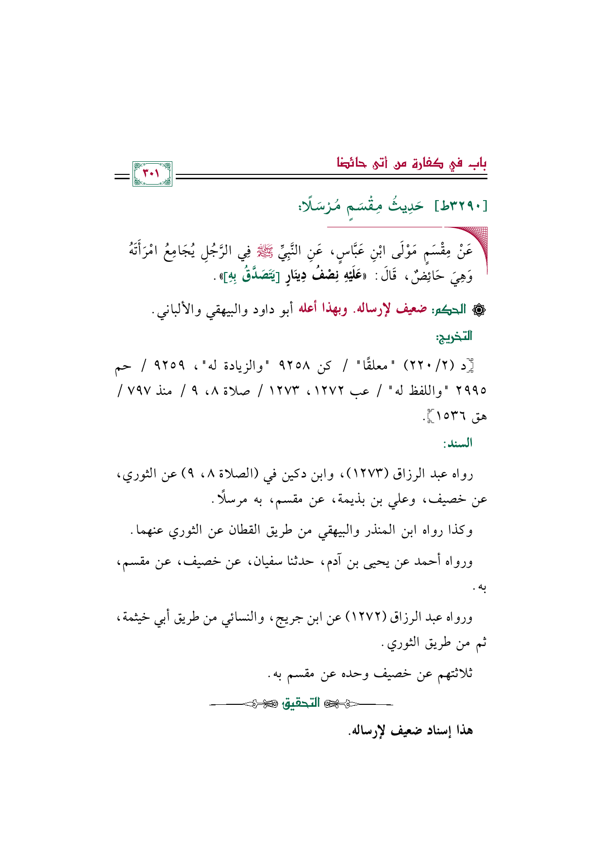 [الحكم]: ضعيف لإرساله. وبهذا أعله أبو داود والبيهقي والألباني.