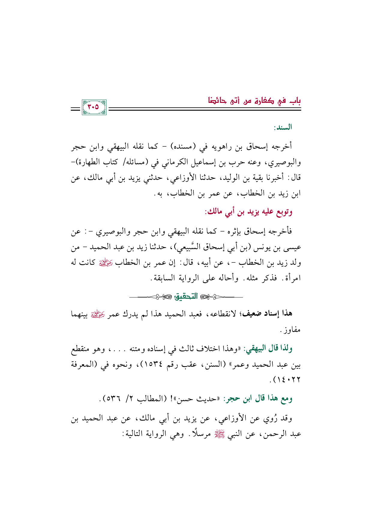 أخرجه إسحاق بن راهويه في (مسنده) - كما نقله البيهقي وابن حجر والبوصيري، وعنه حرب بن إسماعيل الكرماني في (مسائله/ كتاب الطهارة) - قال: أخبرنا بقية بن الوليد، حدثنا الأوزاعي، حدثني يزيد بن أبي مالك، عن ابن زيد بن الخطاب، عن عمر بن الخطاب، به.