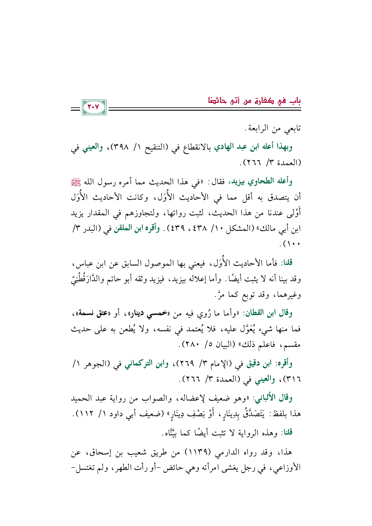 وقال الألباني: ((وهو ضعيف لإعضاله، والصواب من رواية عبد الحميد هذا بلفظ: يَتَصَدَّقُ بِدِينَارٍ، أَوْ نِصْفِ دِينَارٍ)) (ضعيف أبي داود ١/ ١١٢).