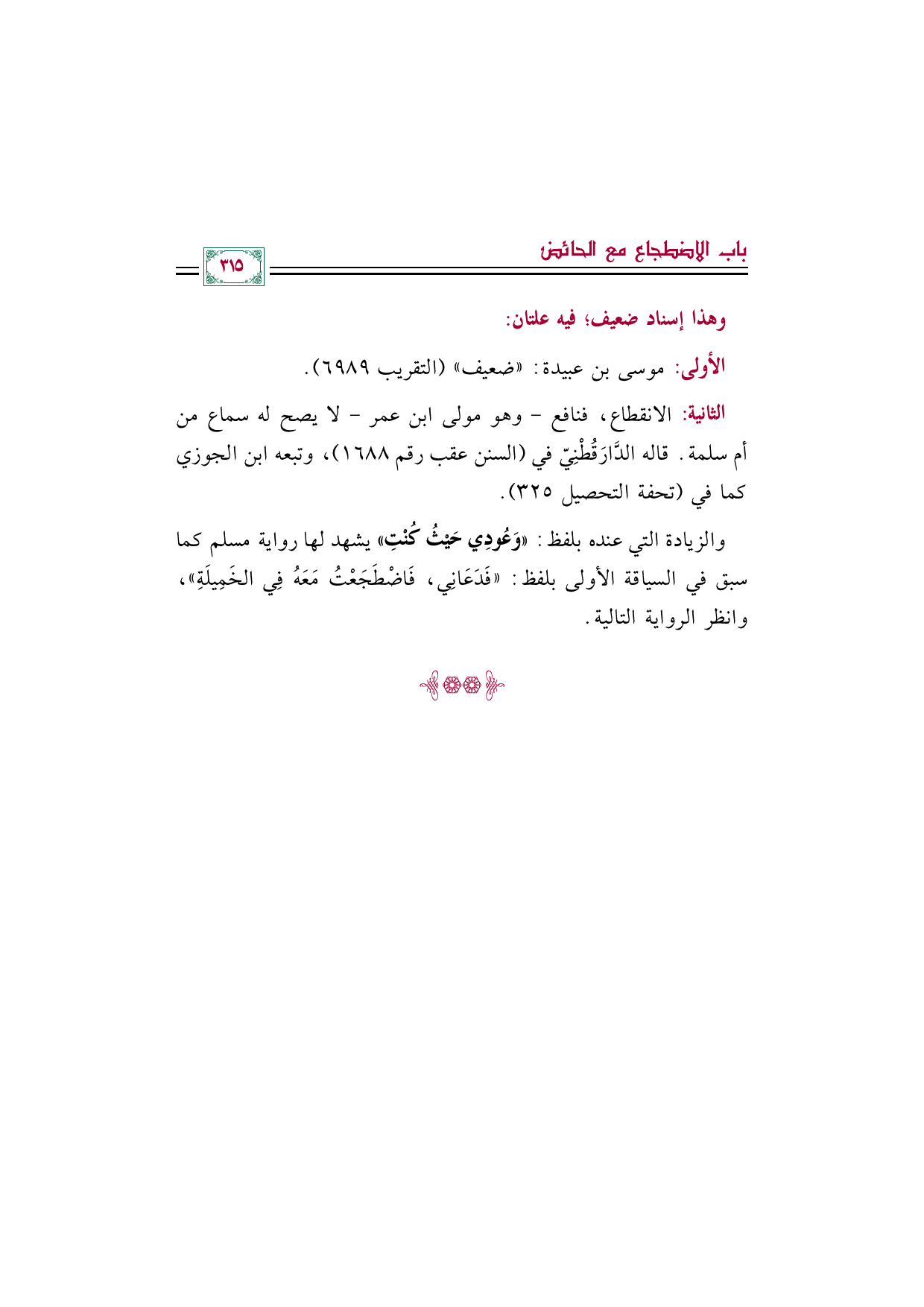 الثانية: الانقطاع، فنافع -وهو مولى ابن عمر- لا يصح له سماع من أم سلمة. قاله الدَّارَقُطْنِيّ في (السنن عقب رقم ١٦٨٨)، وتبعه ابن الجوزي كما في (تحفة التحصيل ٣٢٥).
