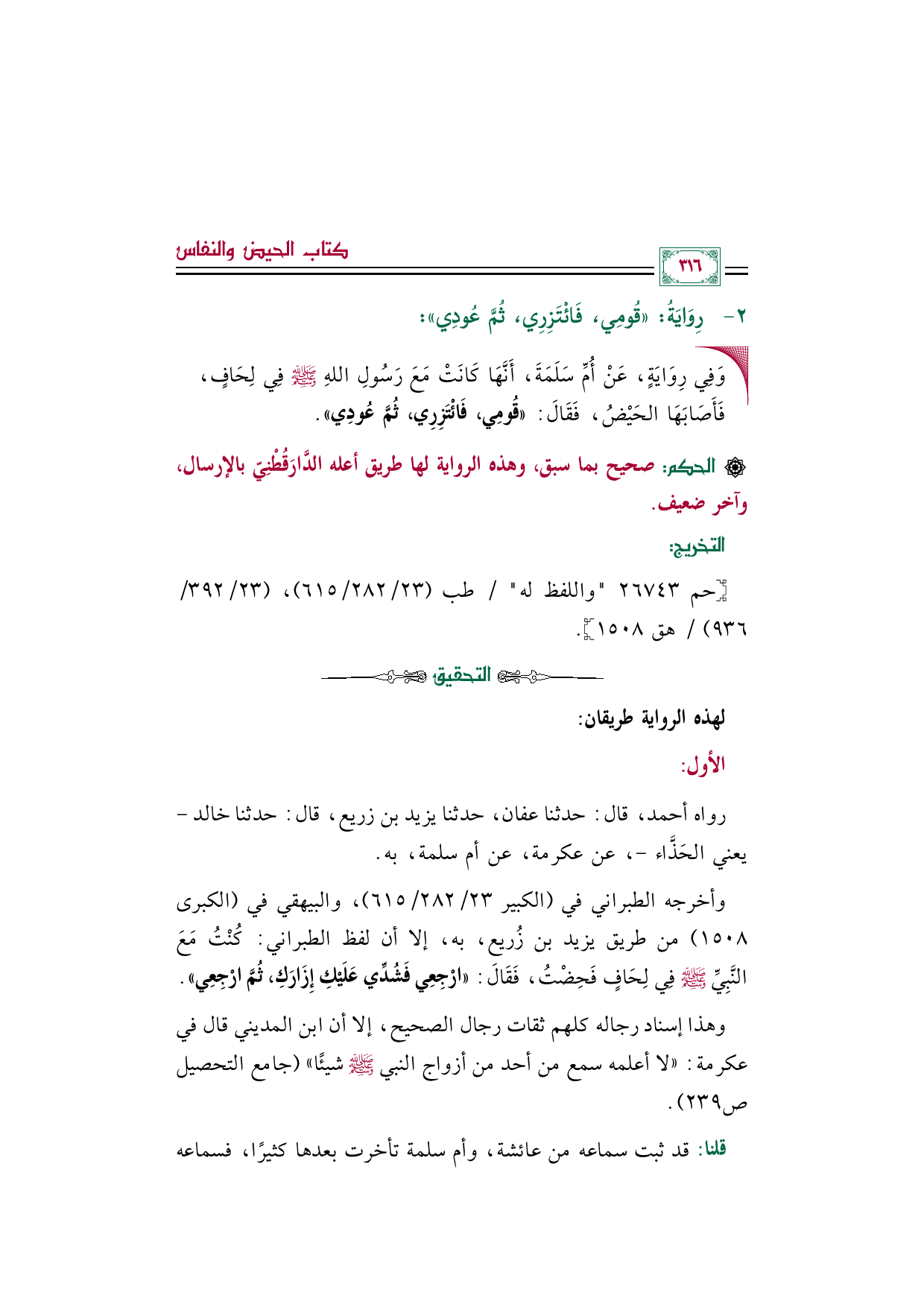 وأخرجه الطبراني في (الكبير ٢٣/ ٢٨٢/ ٦١٥)، والبيهقي في (الكبرى ١٥٠٨) من طريق يزيد بن زُريع، به، إلا أن لفظ الطبراني: كُنْتُ مَعَ النَّبِيِّ صَلَّى اللهُ عَلَيْهِ وَسَلَّمَ فِي لِحَافٍ فَحِضْتُ، فَقَالَ: ((ارْجِعِي فَشُدِّي عَلَيْكِ إِزَارَكِ، ثُمَّ ارْجِعِي)).