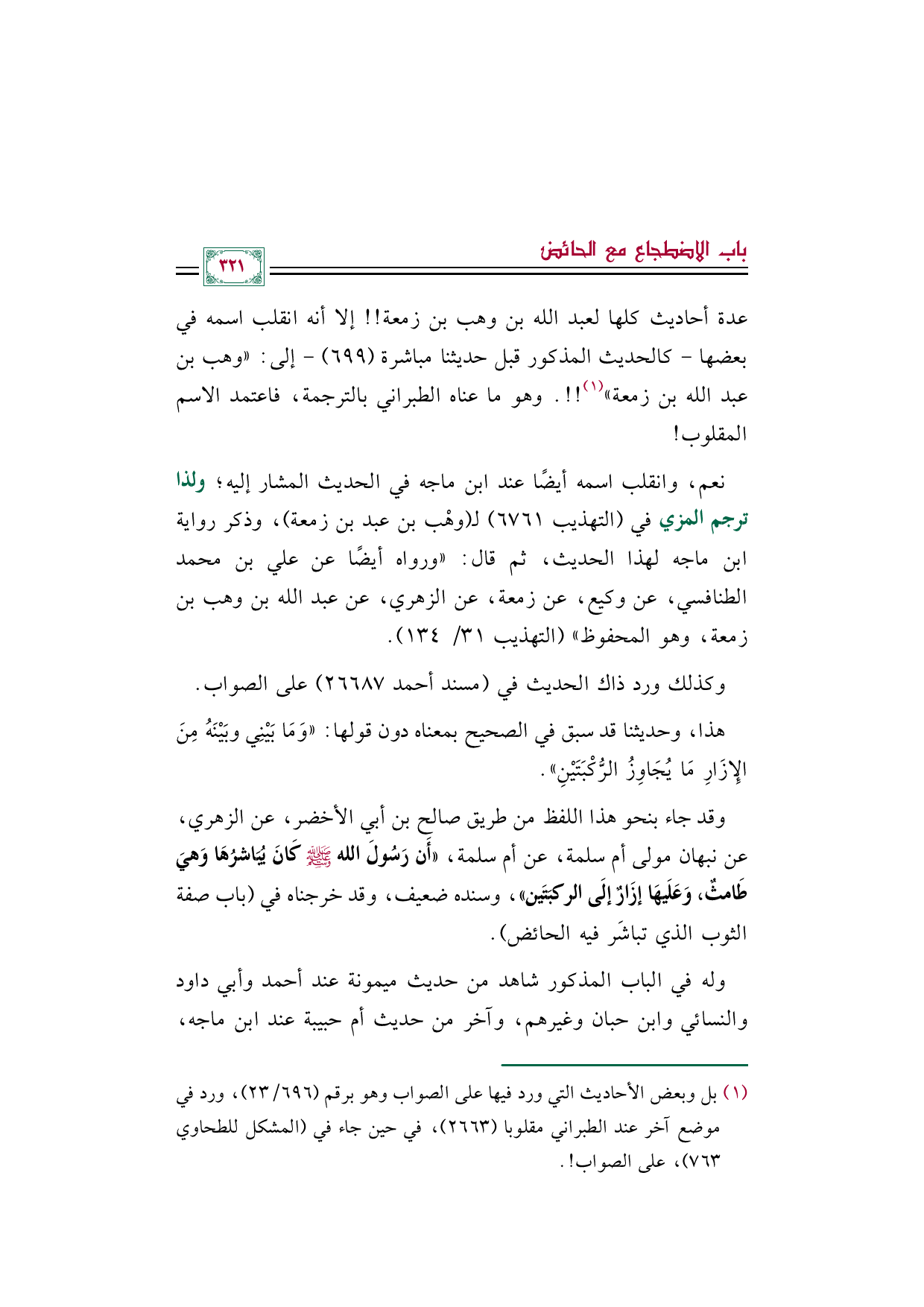 عدة أحاديث كلها لعبد الله بن وهب بن زمعة! ! إلا أنه انقلب اسمه في بعضها -كالحديث المذكور قبل حديثنا مباشرة (٦٩٩) - إلى: ((وهب بن عبد الله بن زمعة)) (¬١)! ! . وهو ما عناه الطبراني بالترجمة، فاعتمد الاسم المقلوب!