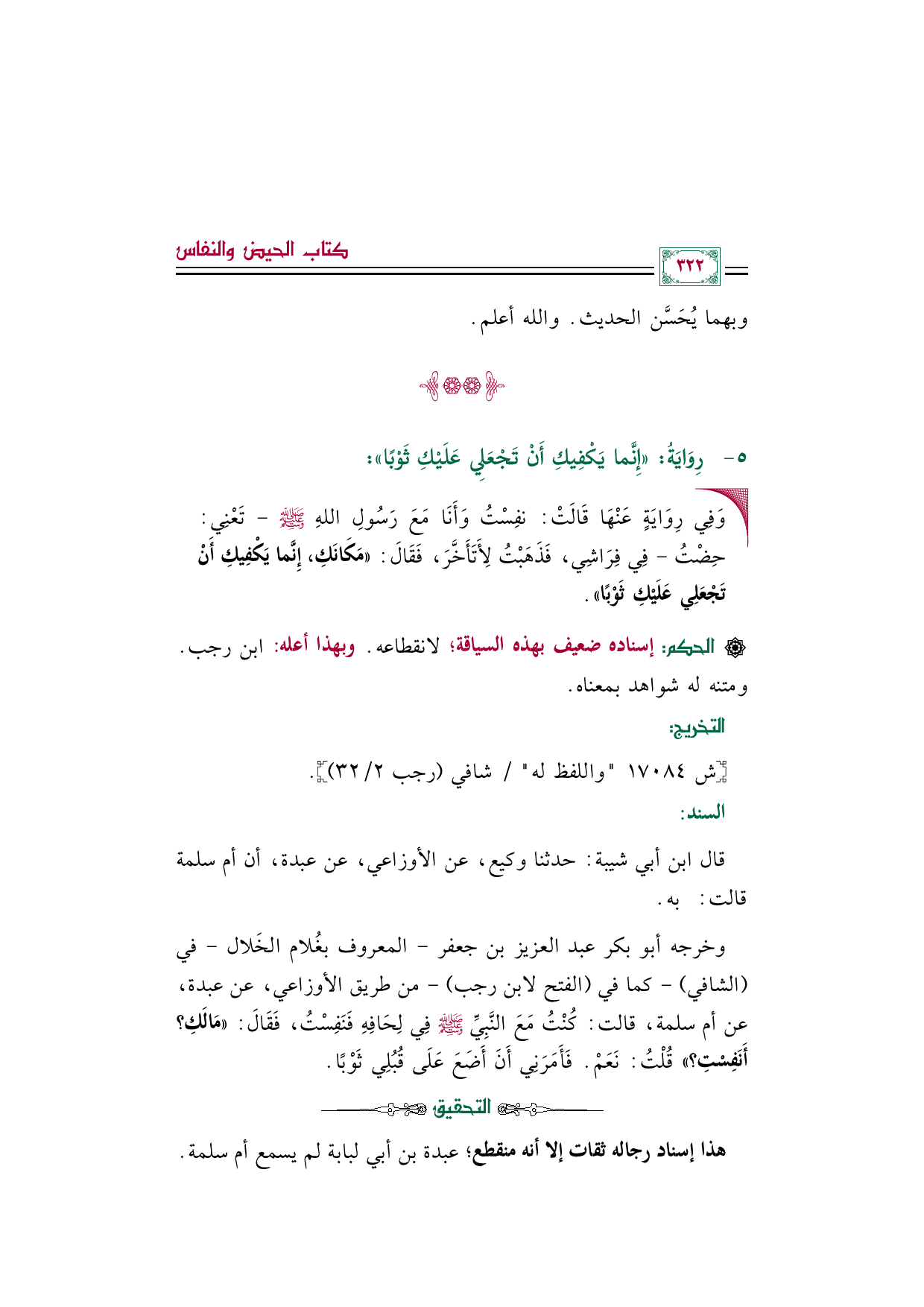 وخرجه أبو بكر عبد العزيز بن جعفر - المعروف بغُلام الخَلال - في (الشافي) - كما في (الفتح لابن رجب) - من طريق الأوزاعي، عن عبدة، عن أم سلمة، قالت: كُنْتُ مَعَ النَّبِيِّ صَلَّى اللهُ عَلَيْهِ وَسَلَّمَ فِي لِحَافِهِ فَنَفِسْتُ، فَقَالَ: ((مَالَكِ؟ أَنَفِسْتِ؟)) قُلْتُ: نَعَمْ. فَأَمَرَنِي أَنَ أَضَعَ عَلَى قُبُلِي ثَوْبًا.
