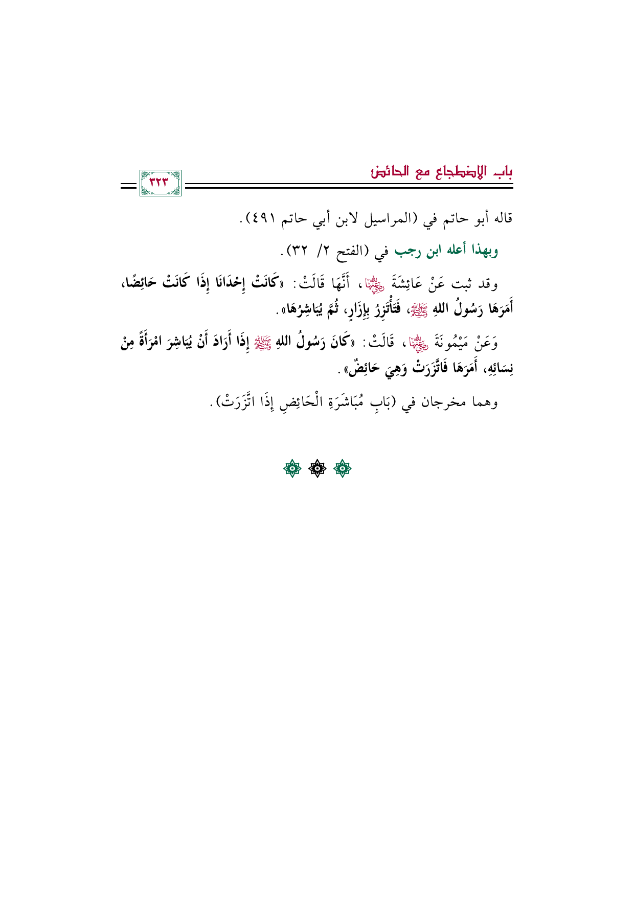 وقد ثبت عَنْ عَائِشَةَ رَضِيَ اللهُ عَنْهَا، أَنَّهَا قَالَتْ: ((كَانَتْ إِحْدَانَا إِذَا كَانَتْ حَائِضًا، أَمَرَهَا رَسُولُ اللهِ صَلَّى اللهُ عَلَيْهِ وَسَلَّمَ، فَتَأْتَزِرُ بِإِزَارٍ، ثُمَّ يُبَاشِرُهَا)).