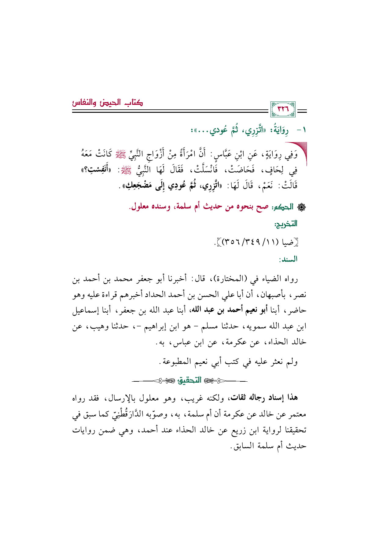 رواه الضياء في (المختارة)، قال: أخبرنا أبو جعفر محمد بن أحمد بن نصر، بأصبهان، أن أبا علي الحسن بن أحمد الحداد أخبرهم قراءة عليه وهو حاضر، أبنا أبو نعيم أحمد بن عبد الله، أبنا عبد الله بن جعفر، أبنا إسماعيل بن عبد الله سمويه، حدثنا مسلم - هو ابن إبراهيم -، حدثنا وهيب، عن خالد الحذاء، عن عكرمة، عن ابن عباس، به.