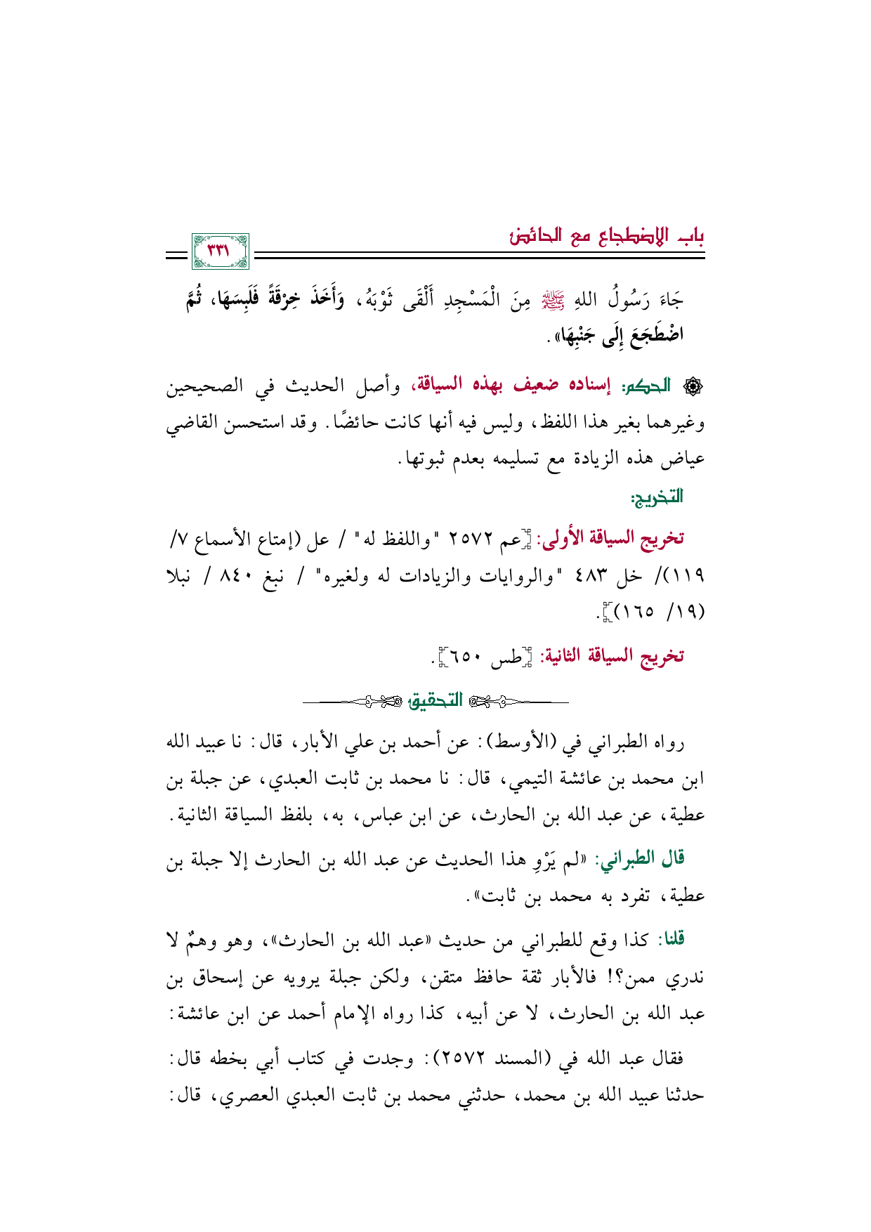 [الحكم]: إسناده ضعيف بهذه السياقة، وأصل الحديث في الصحيحين وغيرهما بغير هذا اللفظ، وليس فيه أنها كانت حائضًا. وقد استحسن القاضي عياض هذه الزيادة مع تسليمه بعدم ثبوتها.
