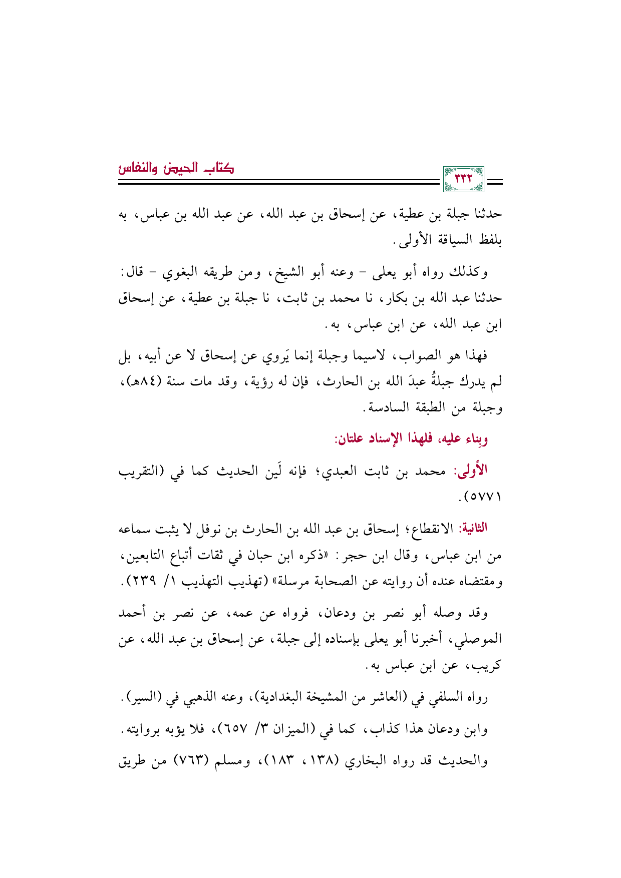 الثانية: الانقطاع؛ إسحاق بن عبد الله بن الحارث بن نوفل لا يثبت سماعه من ابن عباس، وقال ابن حجر: ((ذكره ابن حبان في ثقات أتباع التابعين، ومقتضاه عنده أن روايته عن الصحابة مرسلة)) (تهذيب التهذيب ١/ ٢٣٩).