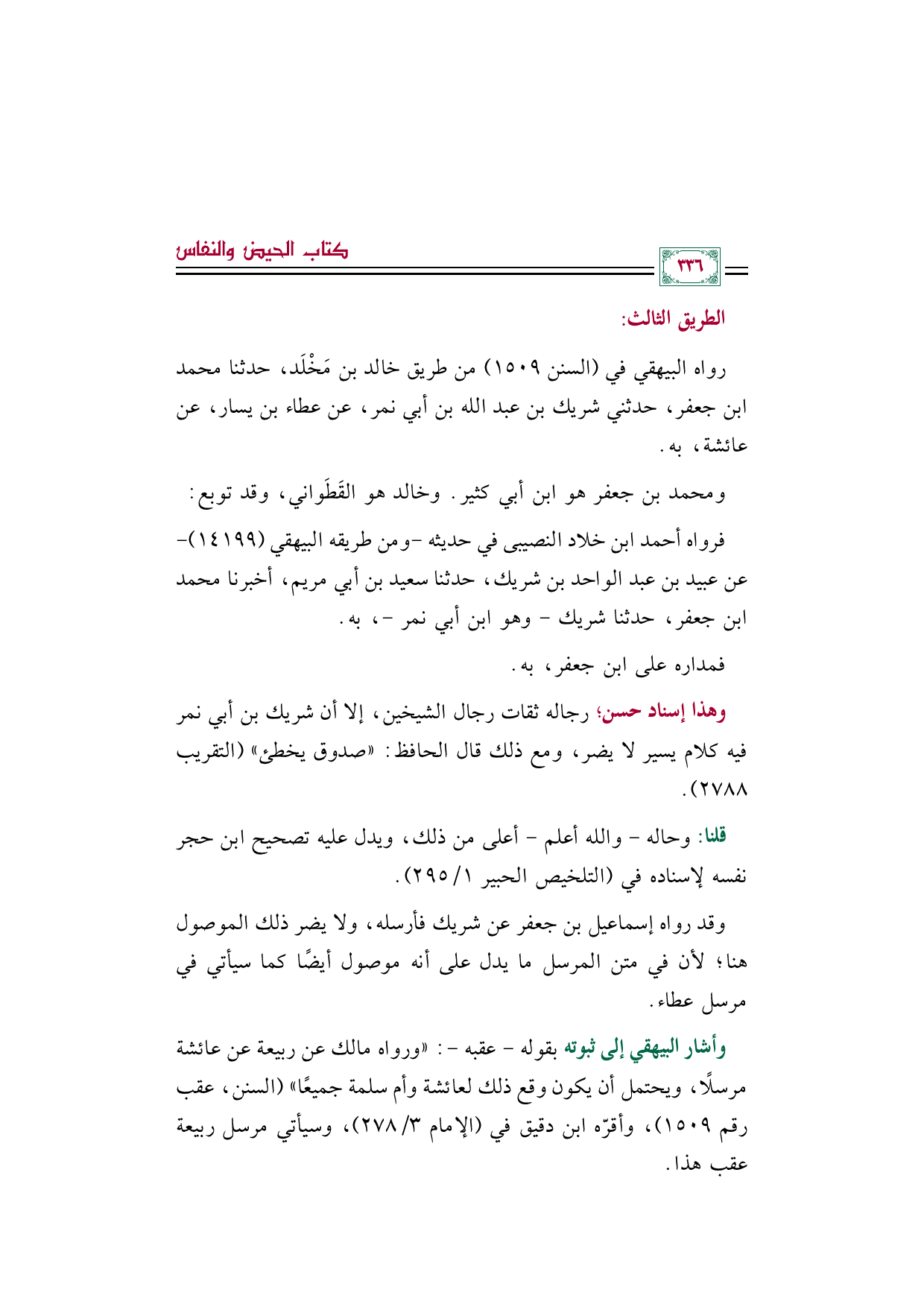 وأشار البيهقي إلى ثبوته بقوله -عقبه-: ((ورواه مالك عن ربيعة عن عائشة مرسلًا، ويحتمل أن يكون وقع ذلك لعائشة وأم سلمة جميعًا)) (السنن، عقب رقم ١٥٠٩)، وأقرّه ابن دقيق في (الإمام ٣/ ٢٧٨)، وسيأتي مرسل ربيعة عقب هذا.