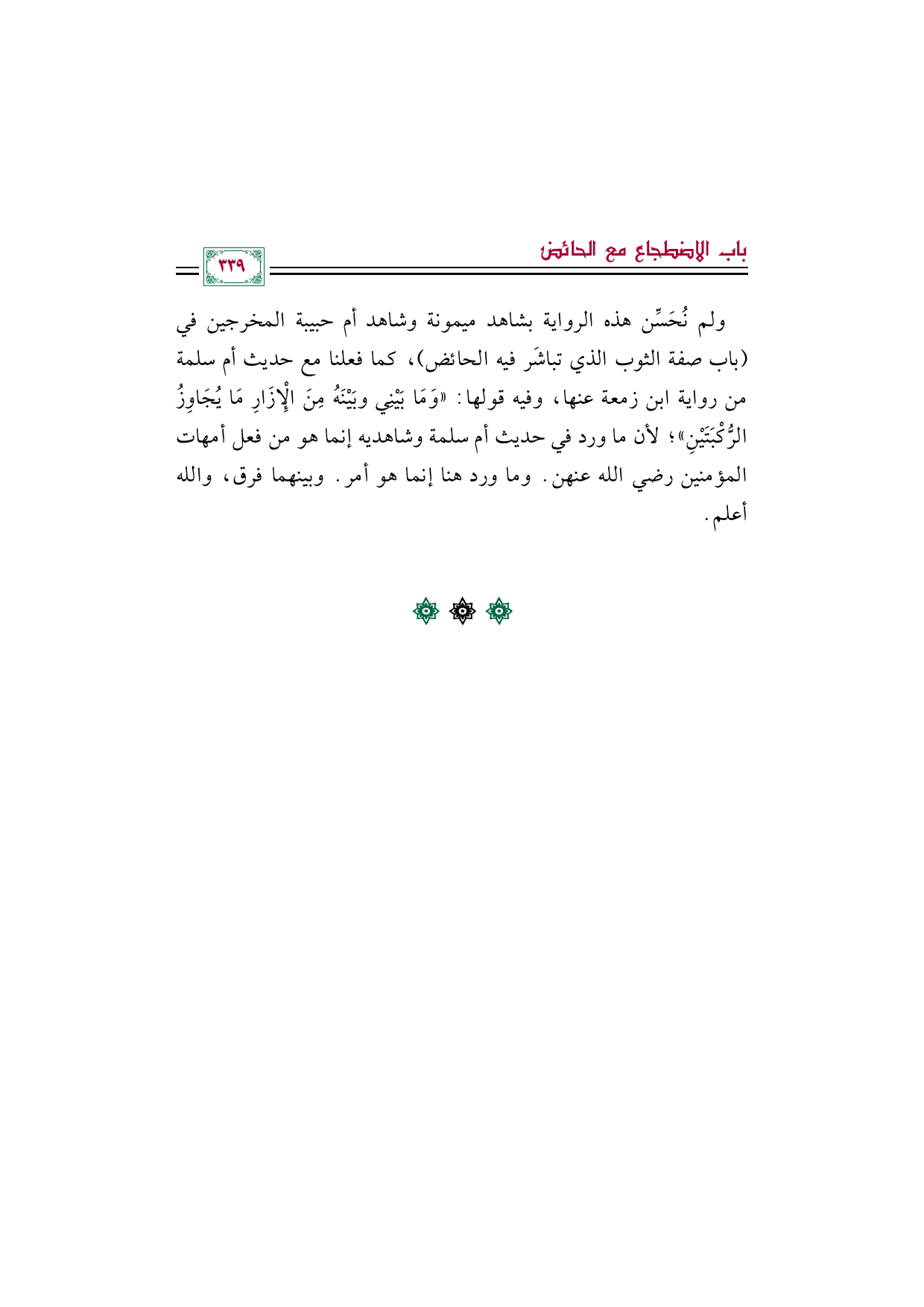 ولم نُحَسِّن هذه الرواية بشاهد ميمونة وشاهد أم حبيبة المخرجين في (باب صفة الثوب الذي تباشَر فيه الحائض)، كما فعلنا مع حديث أم سلمة من رواية ابن زمعة عنها، وفيه قولها: ((وَمَا بَيْنِي وبَيْنَهُ مِنَ الْإِزَارِ مَا يُجَاوِزُ الرُّكْبَتَيْنِ))؛ لأن ما ورد في حديث أم سلمة وشاهديه إنما هو من فعل أمهات المؤمنين رضي الله عنهن. وما ورد هنا إنما هو أمر. وبينهما فرق، والله أعلم.