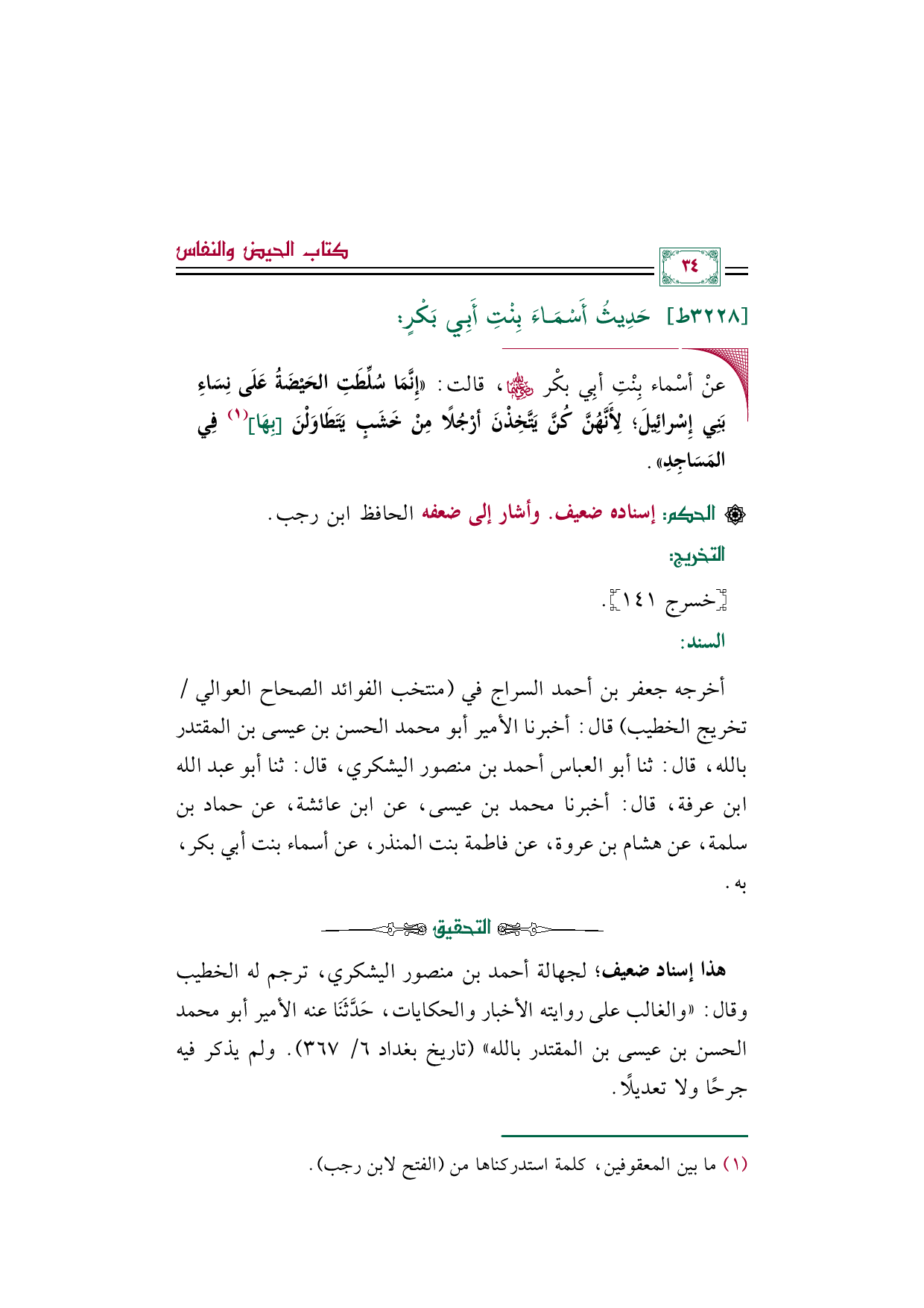أخرجه جعفر بن أحمد السراج في (منتخب الفوائد الصحاح العوالي / تخريج الخطيب) قال: أخبرنا الأمير أبو محمد الحسن بن عيسى بن المقتدر بالله، قال: ثنا أبو العباس أحمد بن منصور اليشكري، قال: ثنا أبو عبد الله بن عرفة، قال: أخبرنا محمد بن عيسى، عن ابن عائشة، عن حماد بن سلمة، عن هشام بن عروة، عن فاطمة بنت المنذر، عن أسماء بنت أبي بكر، به.