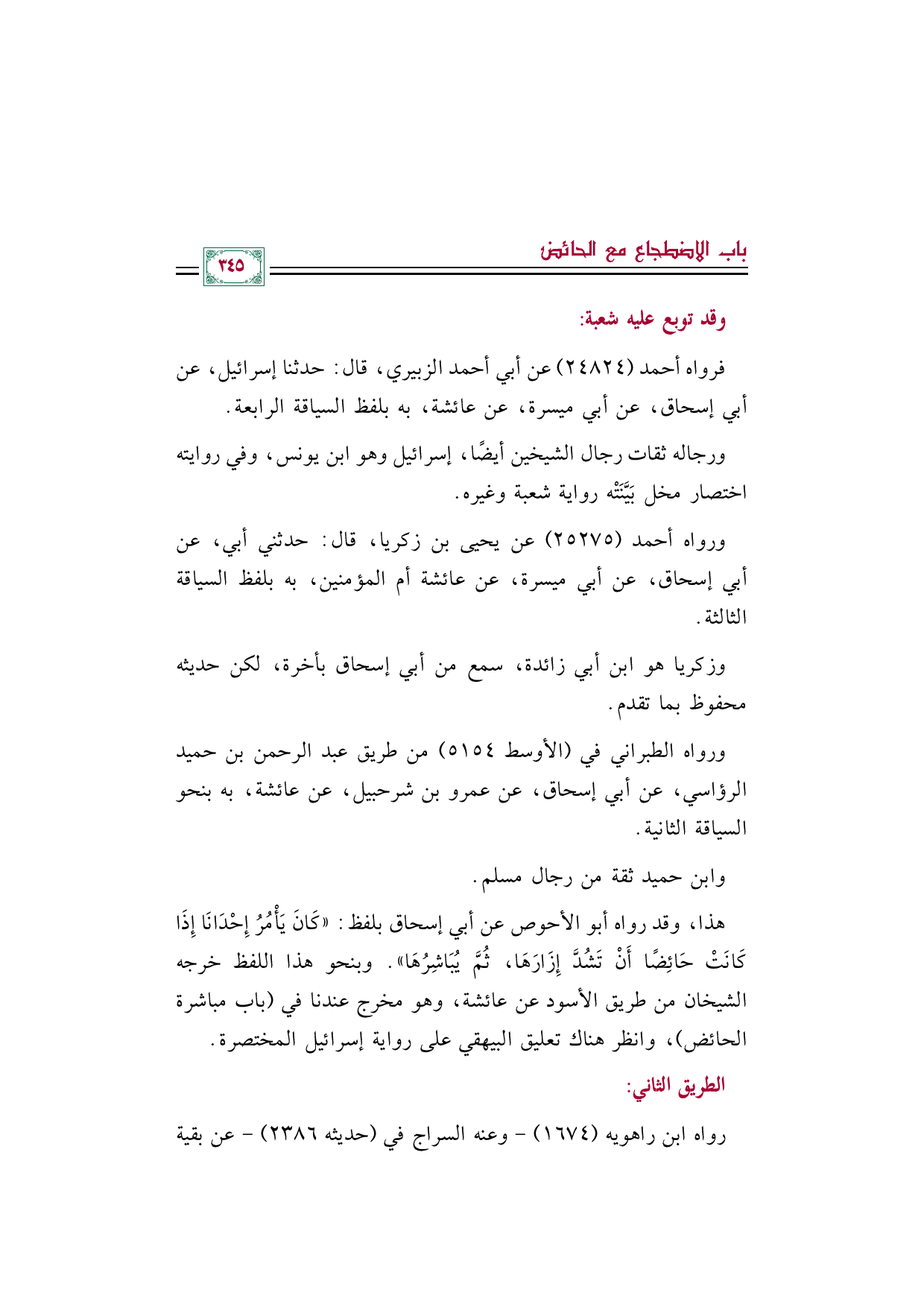 ورواه أحمد (٢٥٢٧٥) عن يحيى بن زكريا، قال: حدثني أبي، عن أبي إسحاق، عن أبي ميسرة، عن عائشة أم المؤمنين، به بلفظ السياقة الثالثة.