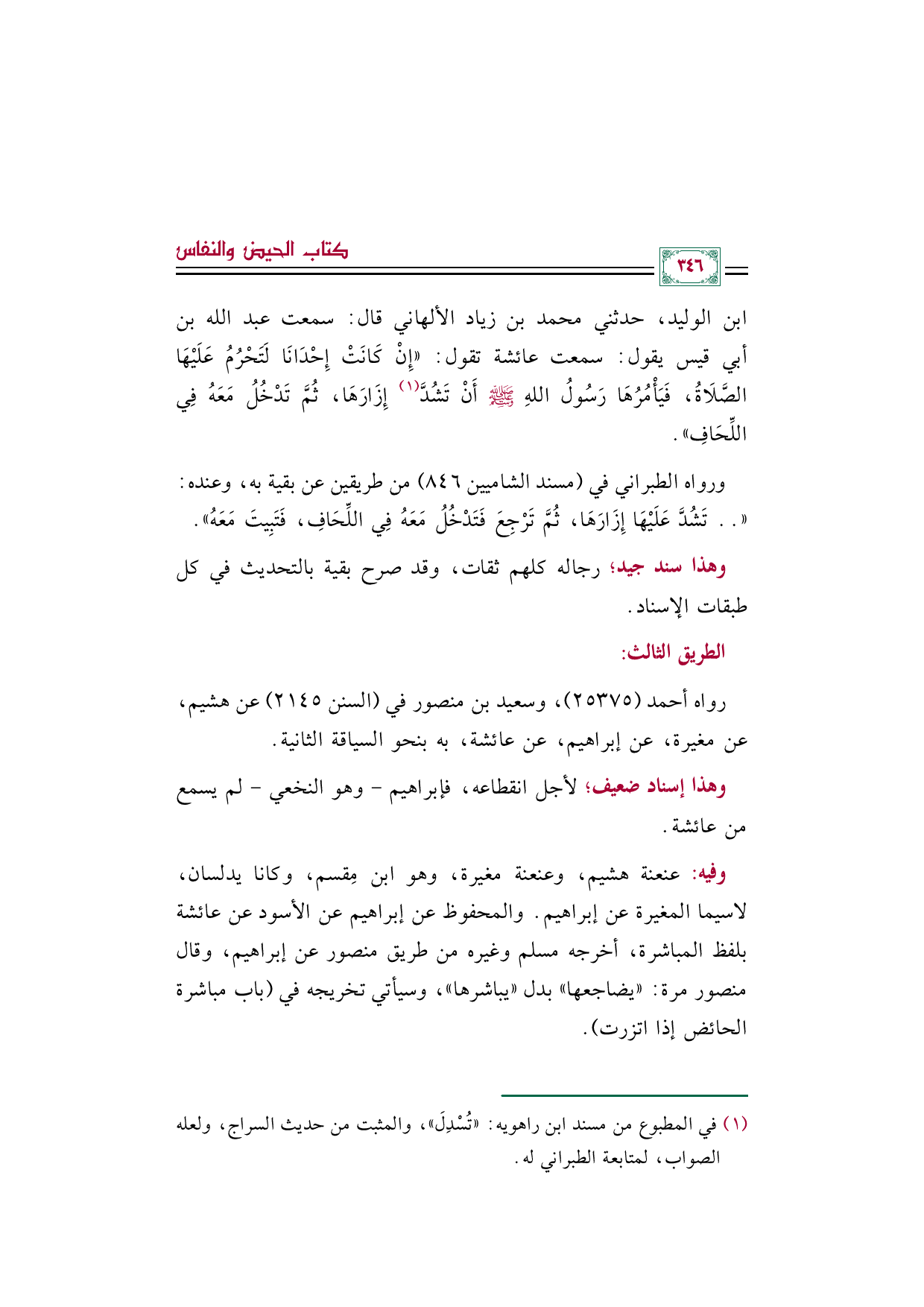 ابن الوليد، حدثني محمد بن زياد الألهاني قال: سمعت عبد الله بن أبي قيس يقول: سمعت عائشة تقول: ((إِنْ كَانَتْ إِحْدَانَا لَتَحْرُمُ عَلَيْهَا الصَّلَاةُ، فَيَأْمُرُهَا رَسُولُ اللهِ صَلَّى اللهُ عَلَيْهِ وَسَلَّمَ أَنْ تَشُدَّ (¬١) إِزَارَهَا، ثُمَّ تَدْخُلُ مَعَهُ فِي اللِّحَافِ)).