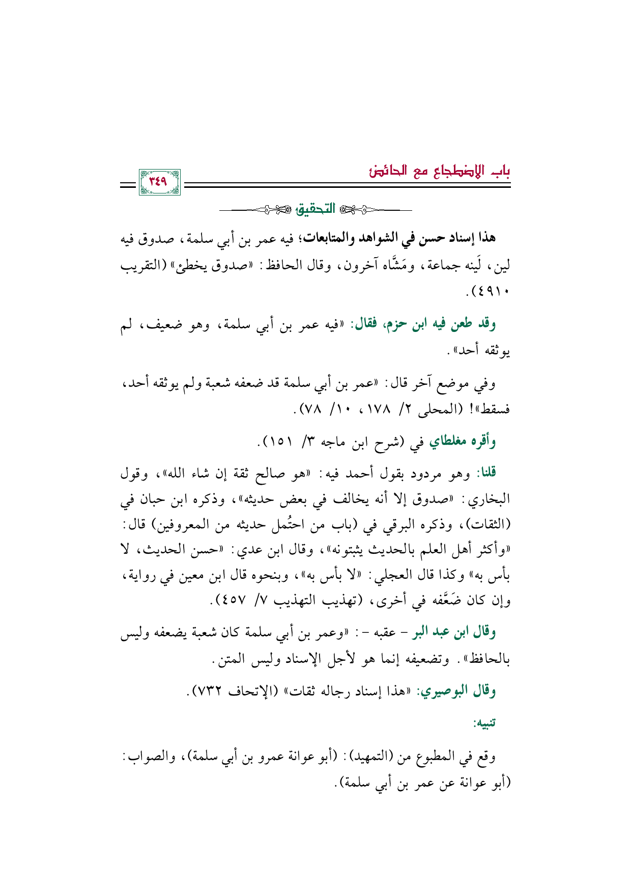 وفي موضع آخر قال: ((عمر بن أبي سلمة قد ضعفه شعبة ولم يوثقه أحد، فسقط))! (المحلى ٢/ ١٧٨، ١٠/ ٧٨).