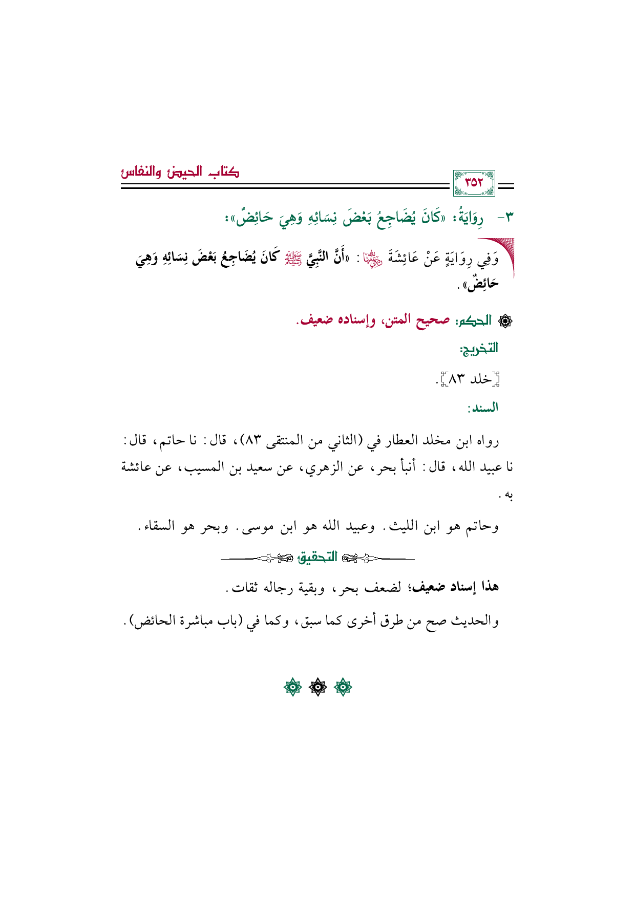 رواه ابن مخلد العطار في (الثاني من المنتقى ٨٣)، قال: نا حاتم، قال: نا عبيد الله، قال: أنبأ بحر، عن الزهري، عن سعيد بن المسيب، عن عائشة به.