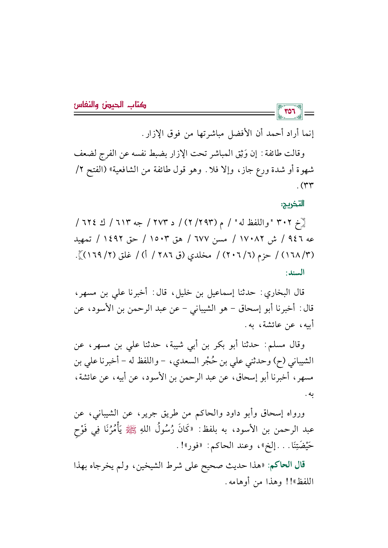 ورواه إسحاق وأبو داود والحاكم من طريق جرير، عن الشيباني، عن عبد الرحمن بن الأسود، به بلفظ: ((كَانَ رُسُولُ اللهِ صَلَّى اللهُ عَلَيْهِ وَسَلَّمَ يَأْمُرُنَا فِي فَوْحِ حَيْضَتِنَا ... إلخ))، وعند الحاكم: ((فور))! .