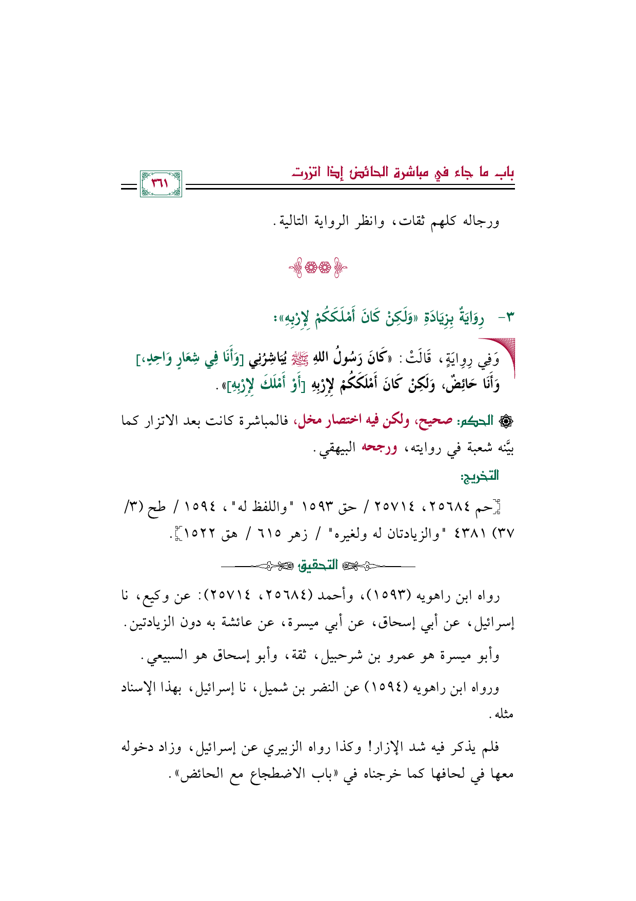 فلم يذكر فيه شد الإزار! وكذا رواه الزبيري عن إسرائيل، وزاد دخوله معها في لحافها كما خرجناه في (باب الاضطجاع مع الحائض).
