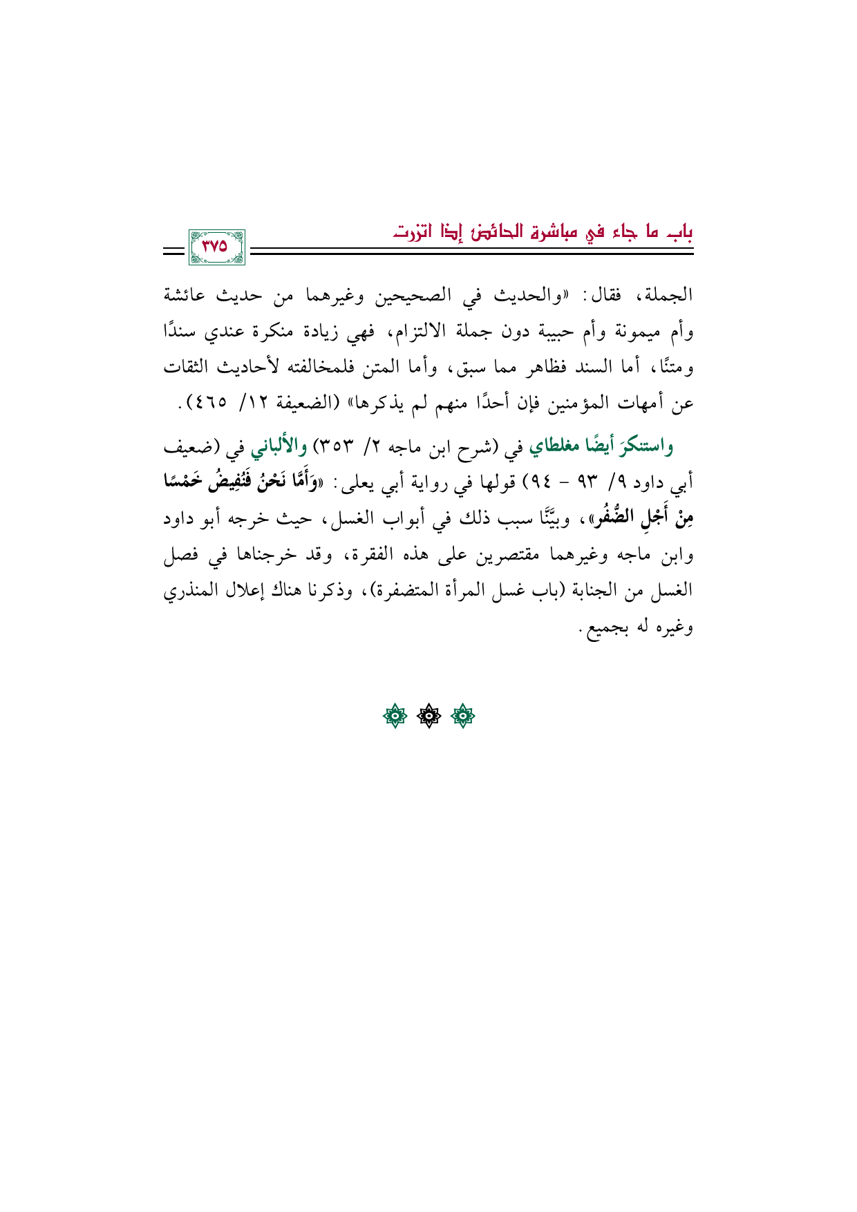 واستنكرَ أيضًا مغلطاي في (شرح ابن ماجه ٢/ ٣٥٣) والألباني في (ضعيف أبي داود ٩/ ٩٣ - ٩٤) قولها في رواية أبي يعلى: ((وَأَمَّا نَحْنُ فَنُفِيضُ خَمْسًا مِنْ أَجْلِ الضُّفُر))، وبيَّنَّا سبب ذلك في أبواب الغسل، حيث خرجه أبو داود وابن ماجه وغيرهما مقتصرين على هذه الفقرة، وقد خرجناها في فصل الغسل من الجنابة (باب غسل المرأة المتضفرة)، وذكرنا هناك إعلال المنذري وغيره له بجميع.