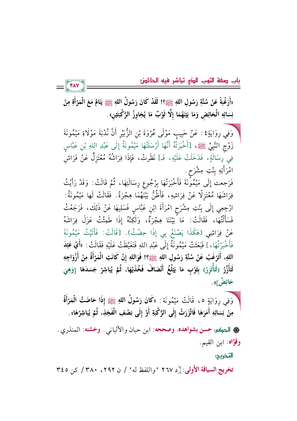 فَرَجعت إِلَى مَيْمُونَةَ فَأَخْبَرَتْهَا بِرُجُوعِ رِسَالَتِهَا، ثُمَّ قَالَتْ: وَقَدْ رَأَيْتُ فِرَاشَهَا مُعْتَزِلًا عَنْ فِرَاشِهِ، فَأَظُنُّ بَيْنَهُمَا هِجْرَةً. فَقَالَتْ لَها مَيْمُونَةُ: ارْجِعِي إِلَى بِنْتِ مِشْرَحٍ امْرَأَةَ ابْنِ عَبَّاسٍ فَسَلِيهَا عَنْ ذَلِكَ، فَرَجَعْتُ فَسَأَلْتُهَا، فَقَالَتْ: مَا بَيْنَنَا هِجْرَةٌ، وَلَكِنَّهُ إِذَا طَمِثْتُ عَزَلَ فِرَاشَهُ عَنْ فِرَاشِي (هَكَذَا يَصْنَعُ بِي إِذَا حِضْتُ). [قَالَتْ: فَأَتَيْتُ مَيْمُونَةَ فَأَخْبَرْتُهَا، ] فَبَعَثَتْ مَيْمُونَةُ إِلَى عَبْدِ اللهِ فَتَغَيَّظَتْ عَلَيْهِ فَقَالَتْ: ((أَيْ عَبْدَ اللهِ، أَتَرْغَبُ عَنْ سُنَّةِ رَسُولِ اللهِ صَلَّى اللهُ عَلَيْهِ وَسَلَّمَ؟ ! فَوَاللهِ إِنْ كَانَتِ الْمَرْأَةُ مِنْ أَزْوَاجِهِ لَتَأَزَّرُ (لَتَأْتَزِرُ) بِثَوْبٍ مَا يَبْلُغُ أَنْصَافَ فَخْذَيْهَا، ثُمَّ يُبَاشِرُ جَسَدَهَا [وَهِيَ حَائِضٌ])).