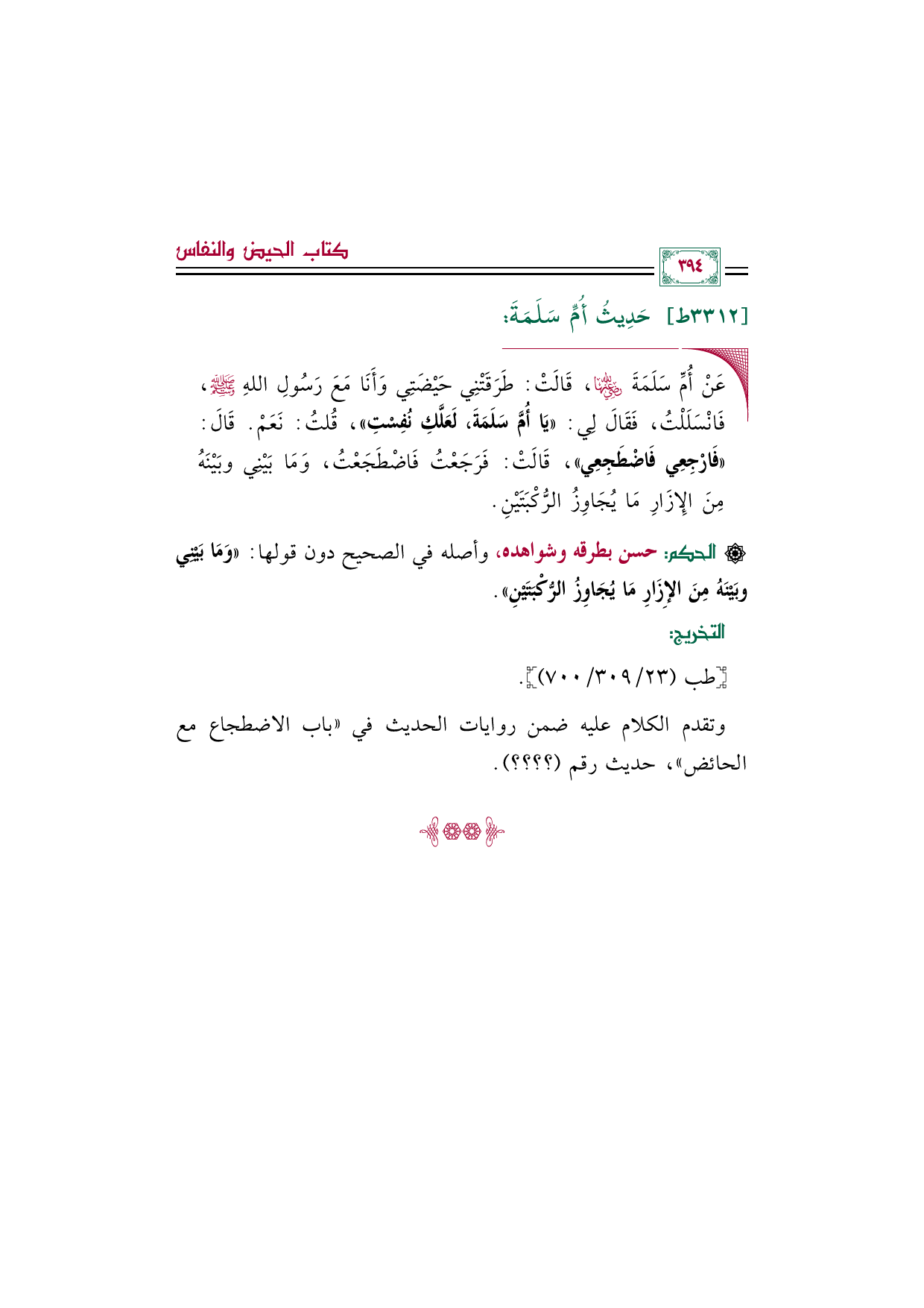 ◼ عَنْ أُمِّ سَلَمَةَ رضي الله عنها، قَالَتْ: طَرَقَتْنِي حَيْضَتِي وَأَنَا مَعَ رَسُولِ اللهِ صَلَّى اللهُ عَلَيْهِ وَسَلَّمَ، فَانْسَلَلْتُ، فَقَالَ لِي: ((يَا أُمَّ سَلَمَةَ، لَعَلَّكِ نُفِسْتِ))، قُلتُ: نَعَمْ. قَالَ: ((فَارْجِعِي فَاضْطَجِعِي))، قَالَتْ: فَرَجَعْتُ فَاضْطَجَعْتُ، وَمَا بَيْنِي وبَيْنَهُ مِنَ الإِزَارِ مَا يُجَاوِزُ الرُّكْبَتَيْنِ.