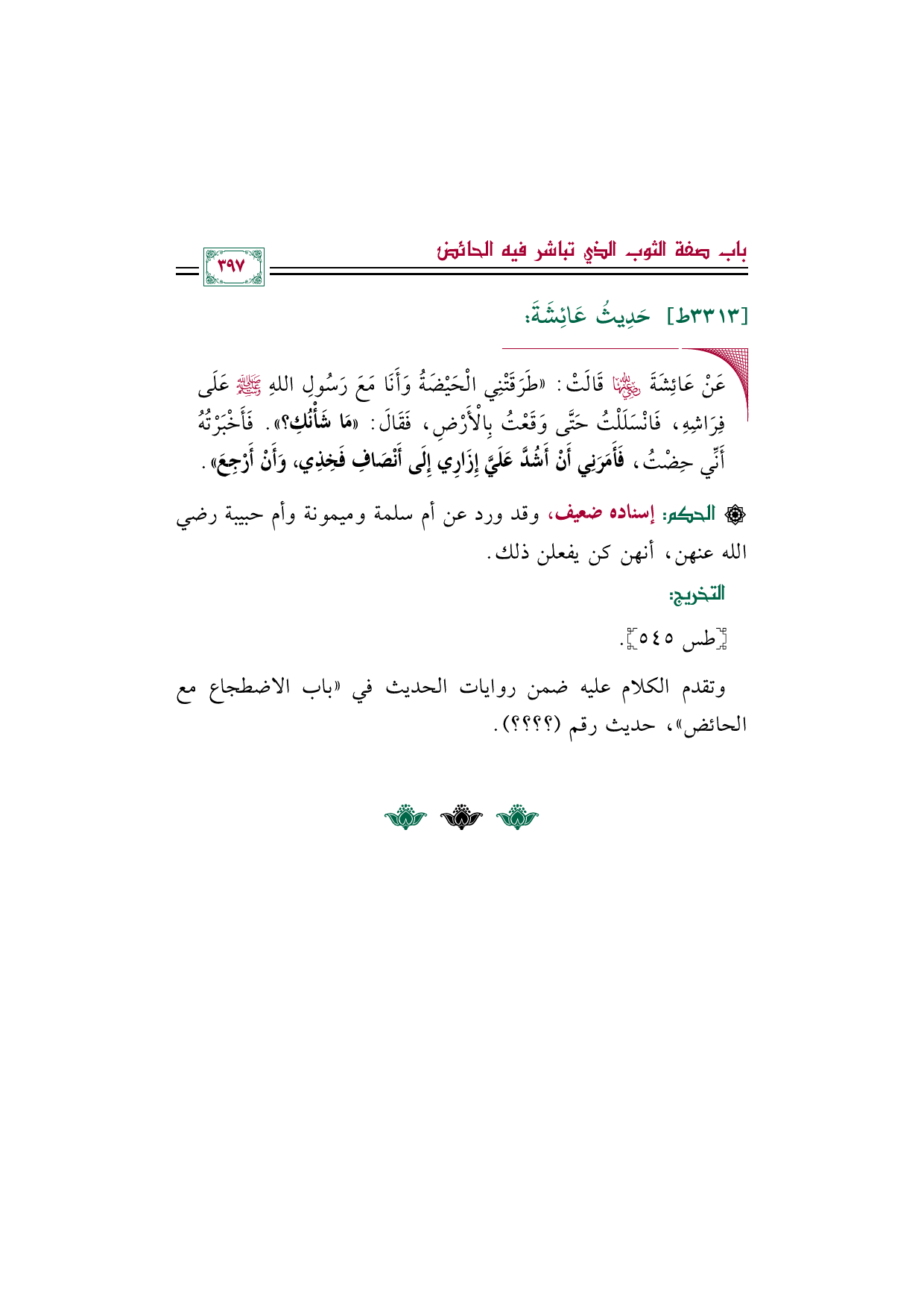◼ عَنْ عَائِشَةَ رَضِيَ اللهُ عَنْهَا قَالَتْ: ((طَرَقَتْنِي الْحَيْضَةُ وَأَنَا مَعَ رَسُولِ اللهِ صَلَّى اللهُ عَلَيْهِ وَسَلَّمَ عَلَى فِرَاشِهِ، فَانْسَلَلْتُ حَتَّى وَقَعْتُ بِالْأَرْضِ، فَقَالَ: ((مَا شَأْنُكِ؟ )). فَأَخْبَرْتُهُ أَنِّي حِضْتُ، فَأَمَرَنِي أَنْ أَشُدَّ عَلَيَّ إِزَارِي إِلَى أَنْصَافِ فَخِذِي، وَأَنْ أَرْجِعَ)).