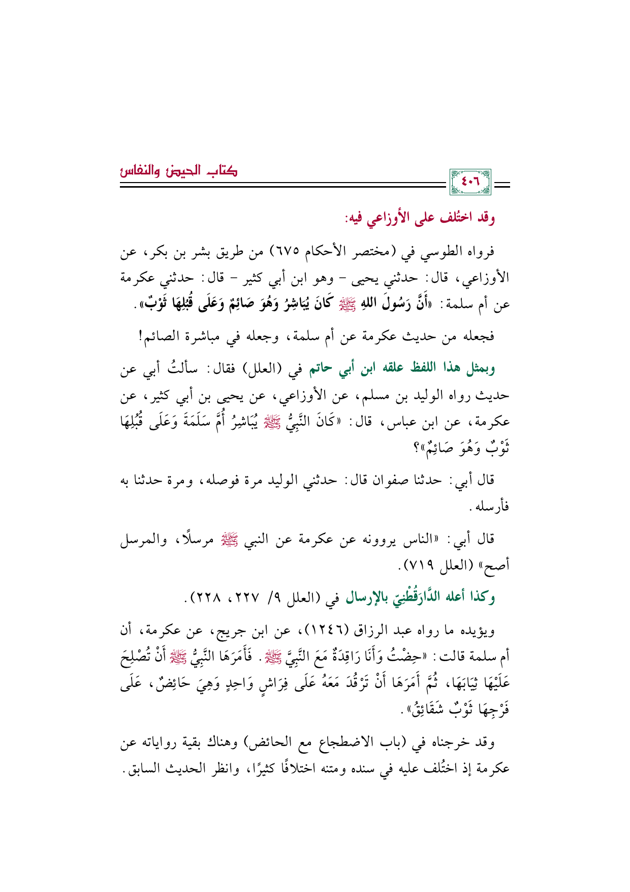 وبمثل هذا اللفظ علقه ابن أبي حاتم في (العلل) فقال: سألتُ أبي عن حديث رواه الوليد بن مسلم، عن الأوزاعي، عن يحيى بن أبي كثير، عن عكرمة، عن ابن عباس، قال: ((كَانَ النَّبِيُّ صَلَّى اللهُ عَلَيْهِ وَسَلَّمَ يُبَاشِرُ أُمَّ سَلَمَةَ وَعَلَى قُبُلِهَا ثَوْبٌ وَهُوَ صَائِمٌ))؟