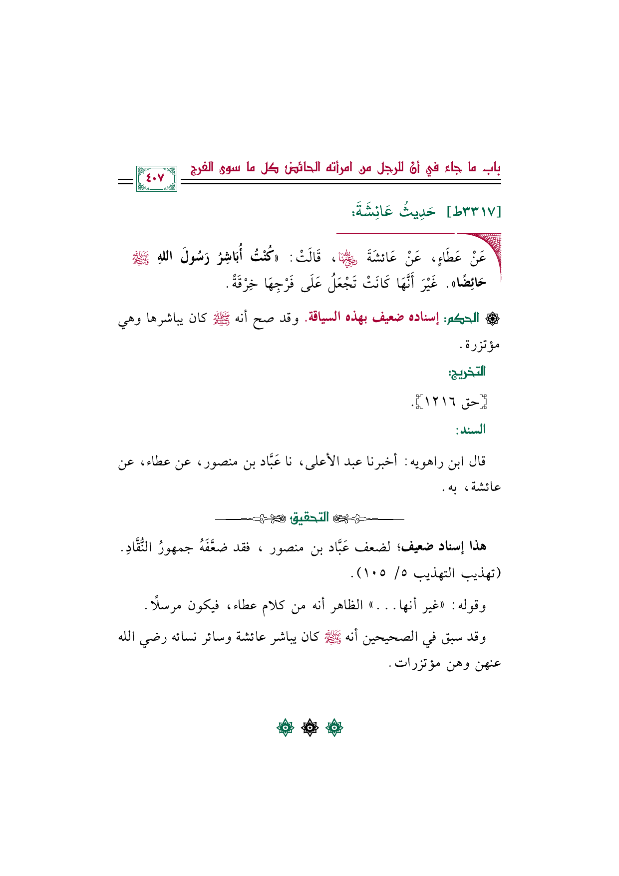 [الحكم]: إسناده ضعيف بهذه السياقة. وقد صح أنه صلى الله عليه وسلم كان يباشرها وهي مؤتزرة.