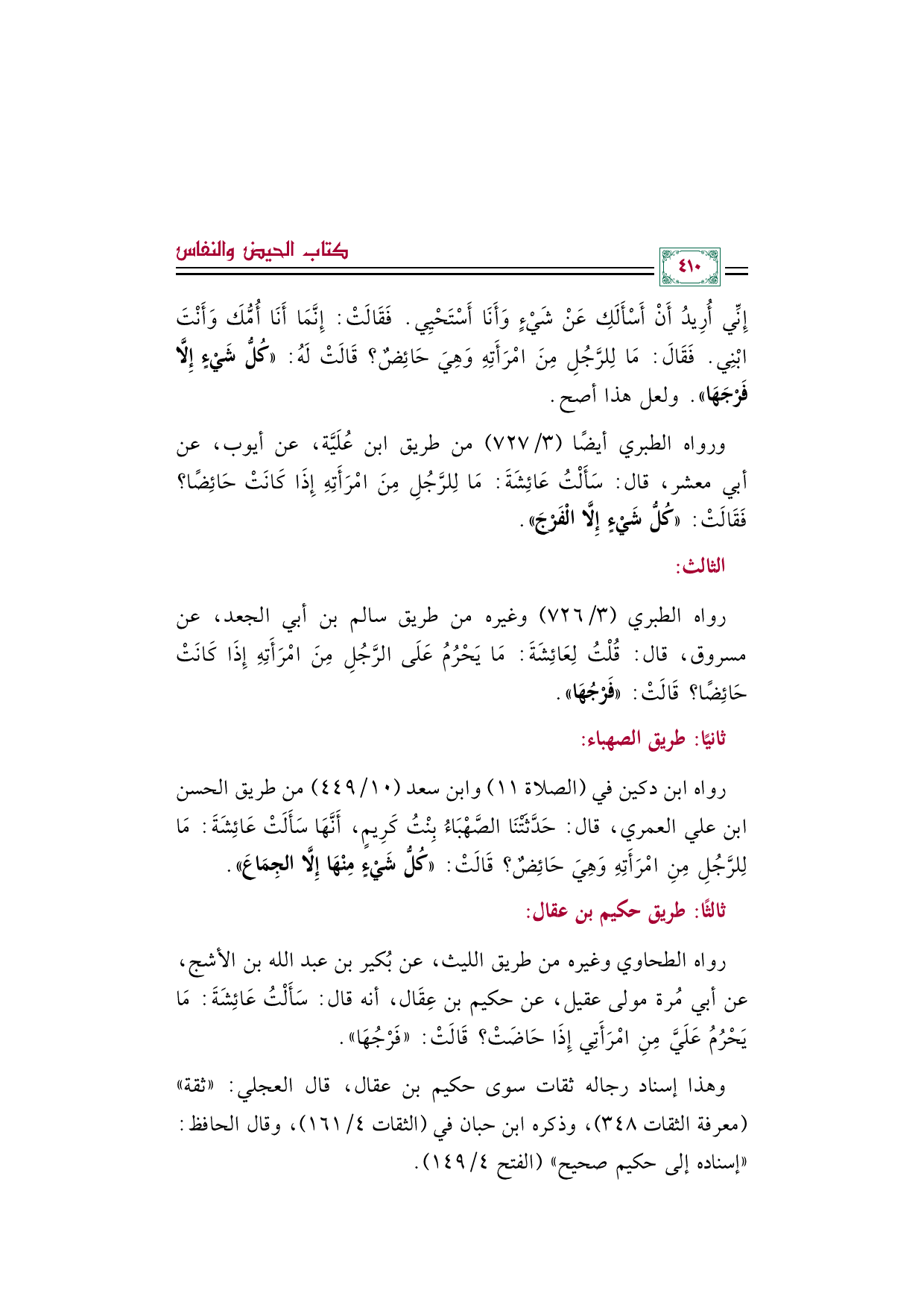 إِنِّي أُرِيدُ أَنْ أَسْأَلَكِ عَنْ شَيْءٍ وَأَنَا أَسْتَحْيِي. فَقَالَتْ: إِنَّمَا أَنَا أُمُّكَ وَأَنْتَ ابْنِي. فَقَالَ: مَا لِلرَّجُلِ مِنَ امْرَأَتِهِ وَهِيَ حَائِضٌ؟ قَالَتْ لَهُ: ((كُلُّ شَيْءٍ إِلَّا فَرْجَهَا)). ولعل هذا أصح.