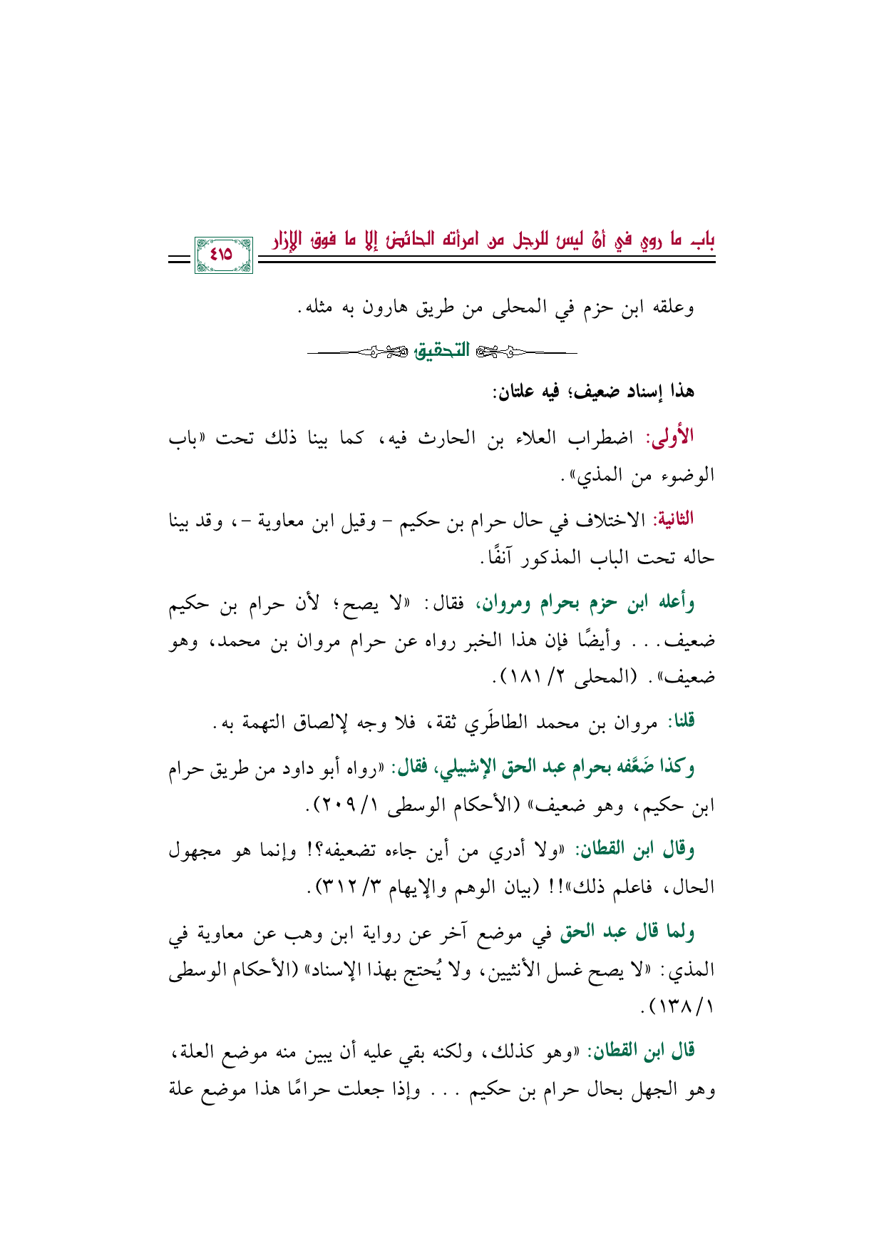 وكذا ضَعَّفه بحرام عبد الحق الإشبيلي، فقال: ((رواه أبو داود من طريق حرام بن حكيم، وهو ضعيف)) (الأحكام الوسطى ١/ ٢٠٩).