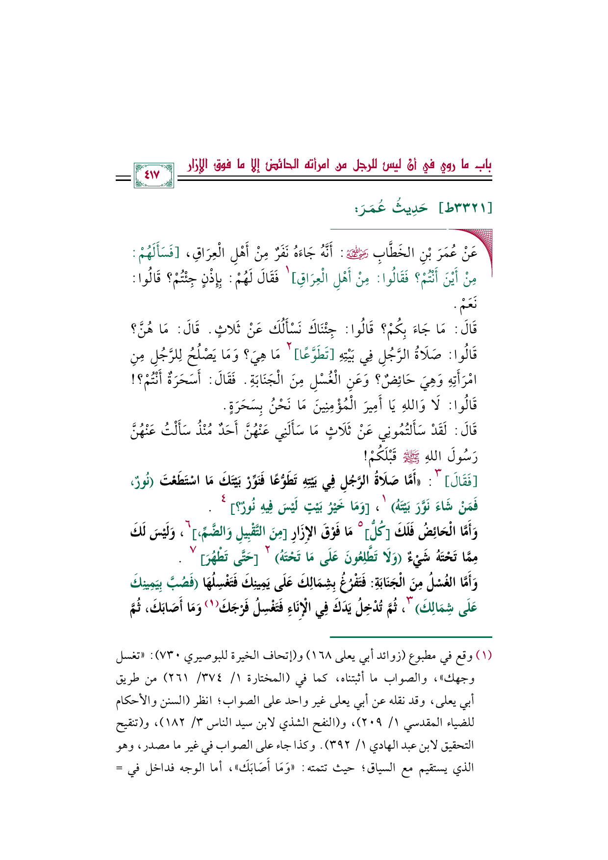◼ عَنْ عُمَرَ بْنِ الخَطَّابِ رَضِيَ اللهُ عَنْهُ: أَنَّهُ جَاءَهُ نَفَرٌ مِنْ أَهْلِ الْعِرَاقِ، [فَسَأَلَهُمْ: مِنْ أَيْنَ أَنْتُمْ؟ فَقَالُوا: مِنْ أَهْلِ الْعِرَاقِ] ١ فَقَالَ لَهُمْ: بِإِذْنٍ جِئْتُمْ؟ قَالُوا: نَعَمْ.