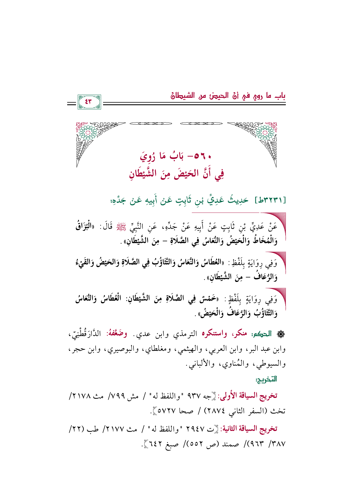 ◼ عَنْ عَدِيِّ بْنِ ثَابِتٍ عَنْ أَبِيهِ عَنْ جَدِّهِ، عَنِ النَّبِيِّ صَلَّى اللهُ عَلَيْهِ وَسَلَّمَ قَالَ: ((الْبُزَاقُ وَالْمُخَاطُ وَالْحَيْضُ وَالنُّعَاسُ فِي الصَّلَاةِ- مِنَ الشَّيْطَانِ)).