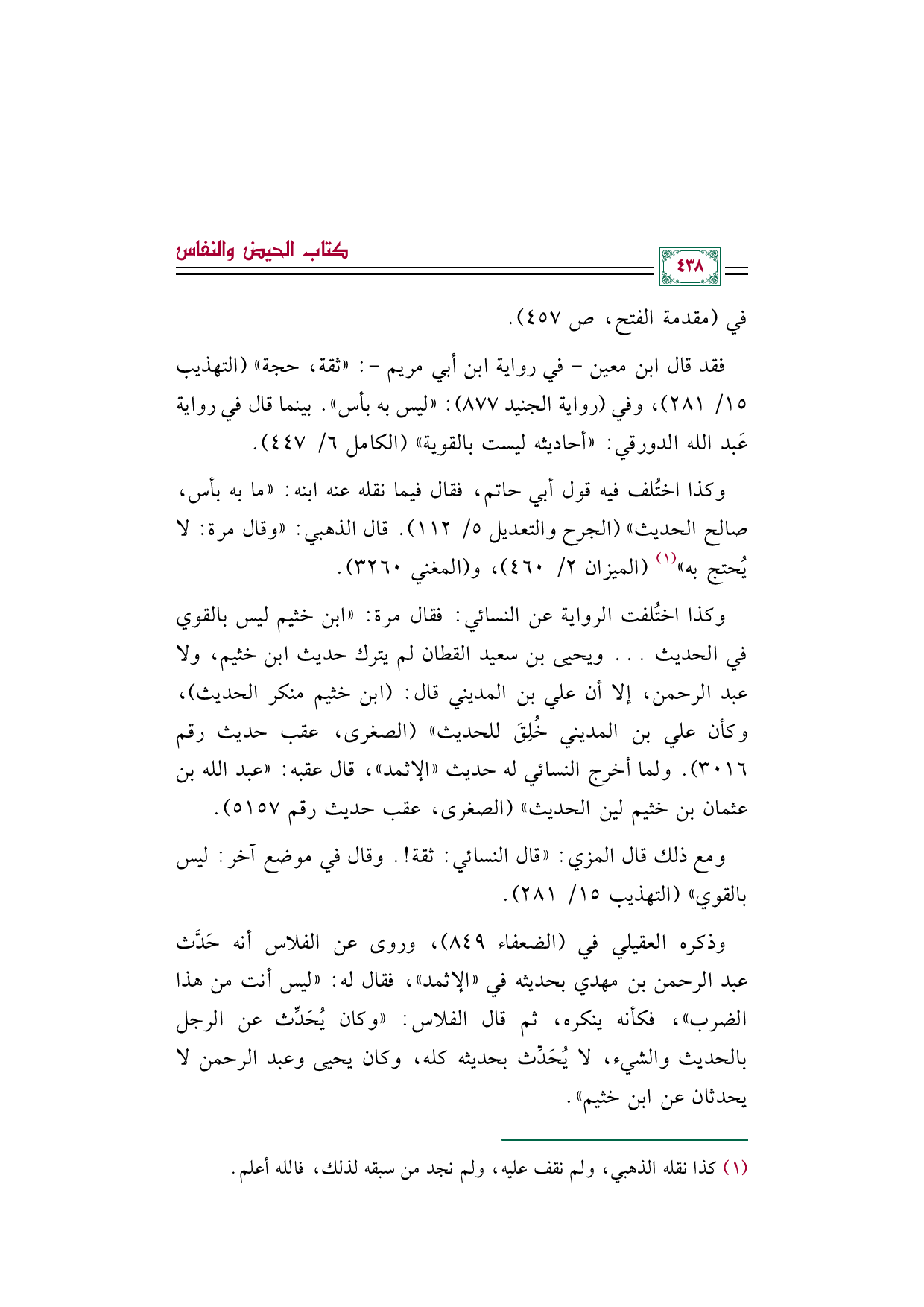 فقد قال ابن معين - في رواية ابن أبي مريم -: ((ثقة، حجة)) (التهذيب ١٥/ ٢٨١)، وفي (رواية الجنيد ٨٧٧): ((ليس به بأس)). بينما قال في رواية عَبد الله الدورقي: ((أحاديثه ليست بالقوية)) (الكامل ٦/ ٤٤٧).