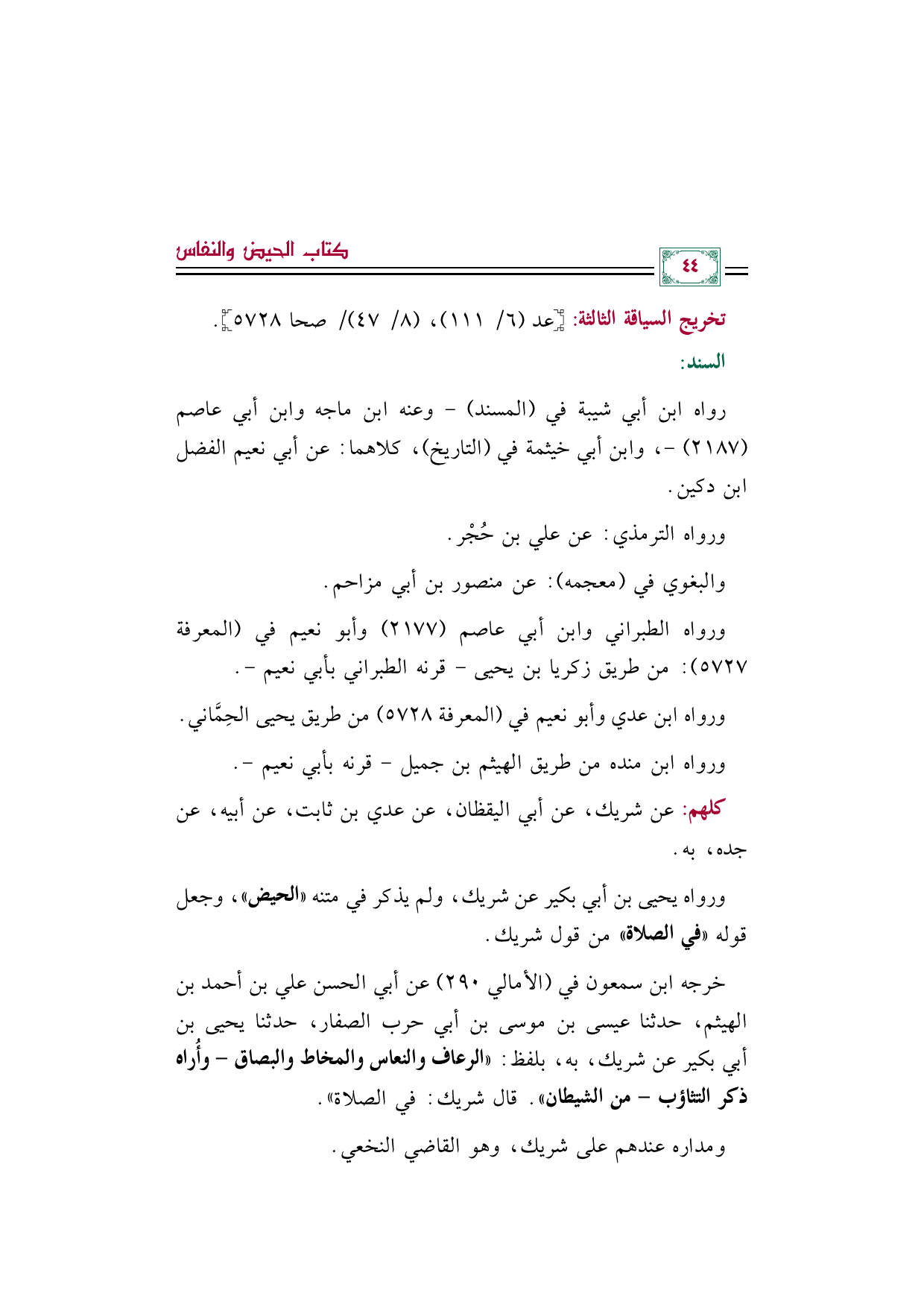 ورواه يحيى بن أبي بكير عن شريك، ولم يذكر في متنه ((الحيض))، وجعل قوله ((في الصلاة)) من قول شريك.