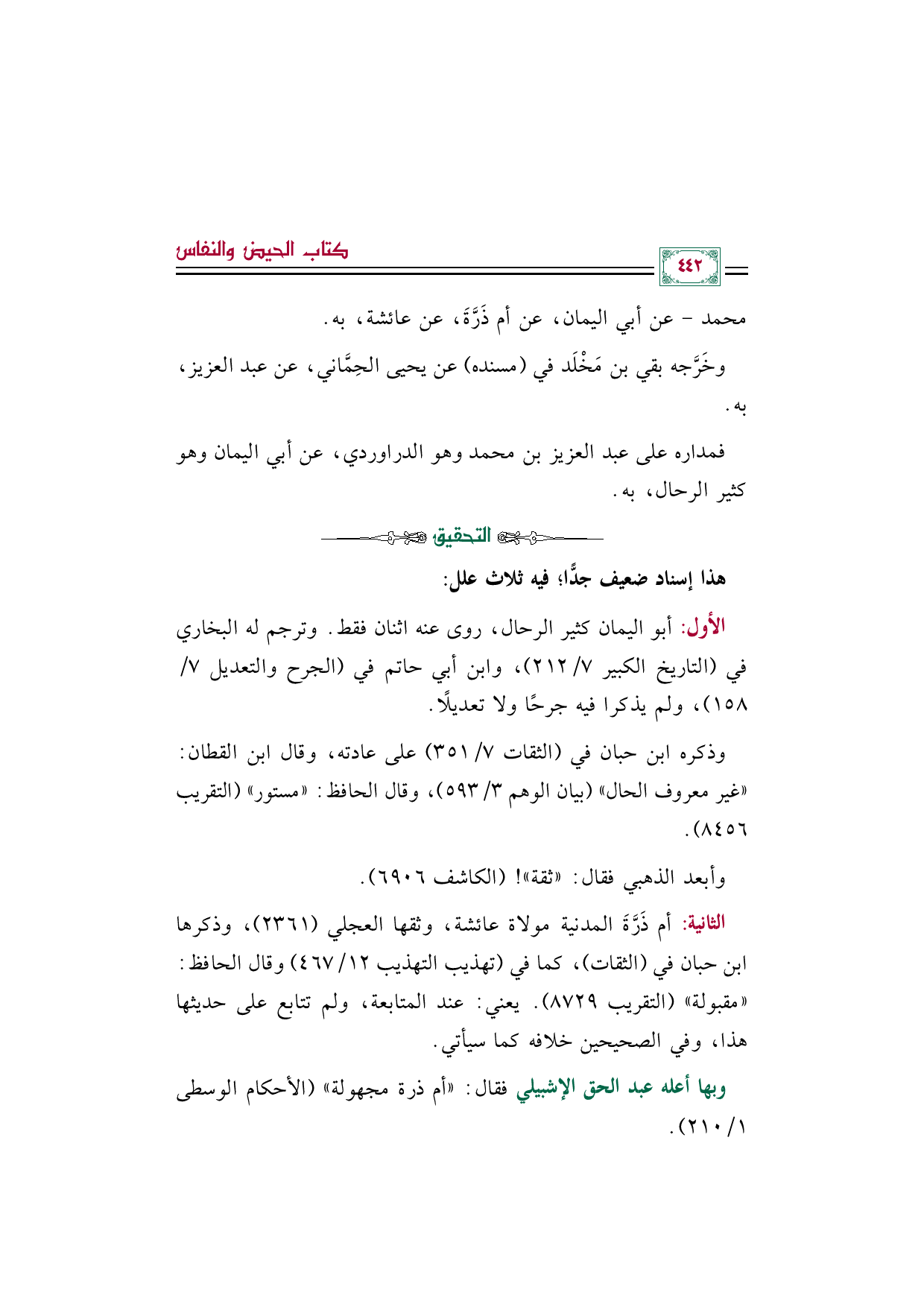 وبها أعله عبد الحق الإشبيلي فقال: ((أم ذرة مجهولة)) (الأحكام الوسطى ١/ ٢١٠).