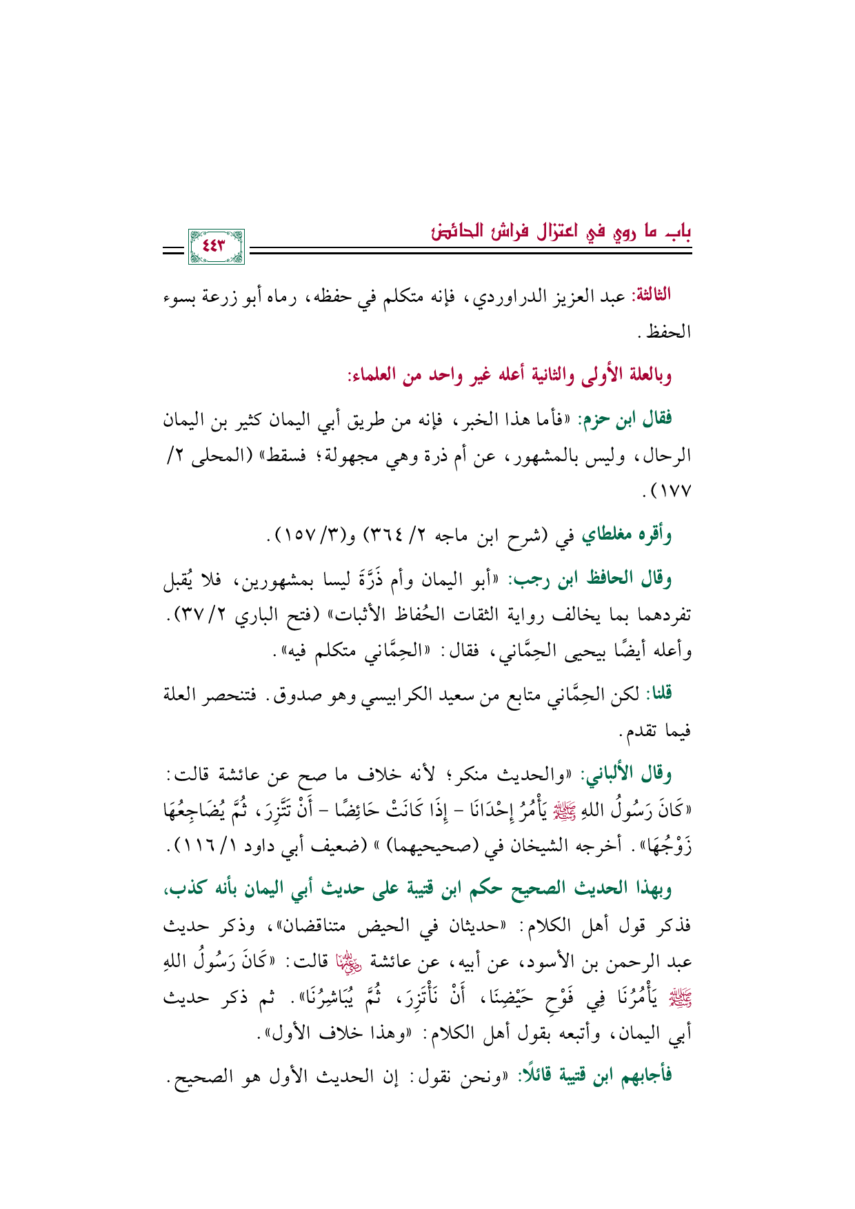 وبهذا الحديث الصحيح حكم ابن قتيبة على حديث أبي اليمان بأنه كذب، فذكر قول أهل الكلام: ((حديثان في الحيض متناقضان))، وذكر حديث عبد الرحمن بن الأسود، عن أبيه، عن عائشة رضي الله عنها قالت: ((كَانَ رَسُولُ اللهِ صَلَّى اللهُ عَلَيْهِ وَسَلَّمَ يَأْمُرُنَا فِي فَوْحِ حَيْضِنَا، أَنْ نَأْتَزِرَ، ثُمَّ يُبَاشِرُنَا)). ثم ذكر حديث أبي اليمان، وأتبعه بقول أهل الكلام: ((وهذا خلاف الأول)).