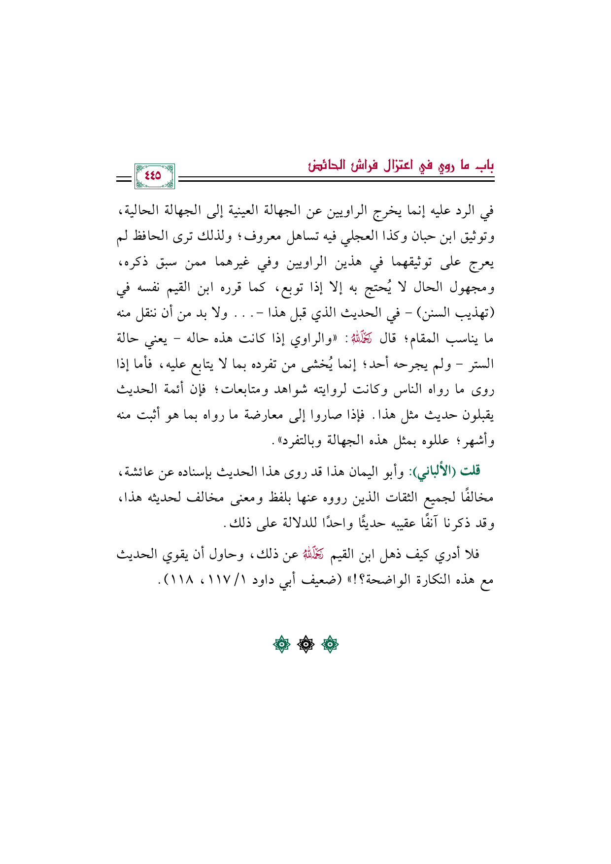 في الرد عليه إنما يخرج الراويين عن الجهالة العينية إلى الجهالة الحالية، وتوثيق ابن حبان وكذا العجلي فيه تساهل معروف؛ ولذلك ترى الحافظ لم يعرج على توثيقهما في هذين الراويين وفي غيرهما ممن سبق ذكره، ومجهول الحال لا يُحتج به إلا إذا توبع، كما قرره ابن القيم نفسه في (تهذيب السنن) -في الحديث الذي قبل هذا- ... ولا بد من أن ننقل منه ما يناسب المقام؛ قال رحمه الله: ((والراوي إذا كانت هذه حاله- يعني حالة الستر- ولم يجرحه أحد؛ إنما يُخشى من تفرده بما لا يتابع عليه، فأما إذا روى ما رواه الناس وكانت لروايته شواهد ومتابعات؛ فإن أئمة الحديث يقبلون حديث مثل هذا. فإذا صاروا إلى معارضة ما رواه بما هو أثبت منه وأشهر؛ عللوه بمثل هذه الجهالة وبالتفرد)).