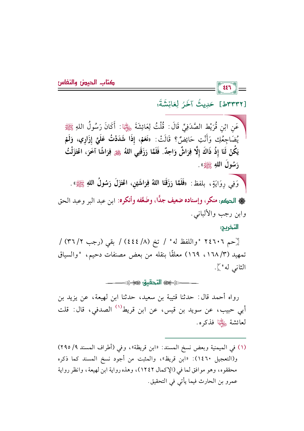 رواه أحمد قال: حدثنا قتيبة بن سعيد، حدثنا ابن لهيعة، عن يزيد بن أبي حبيب، عن سويد بن قيس، عن ابن قريط (¬١) الصدفي، قال: قلت لعائشة رضي الله عنها ... فذكره.