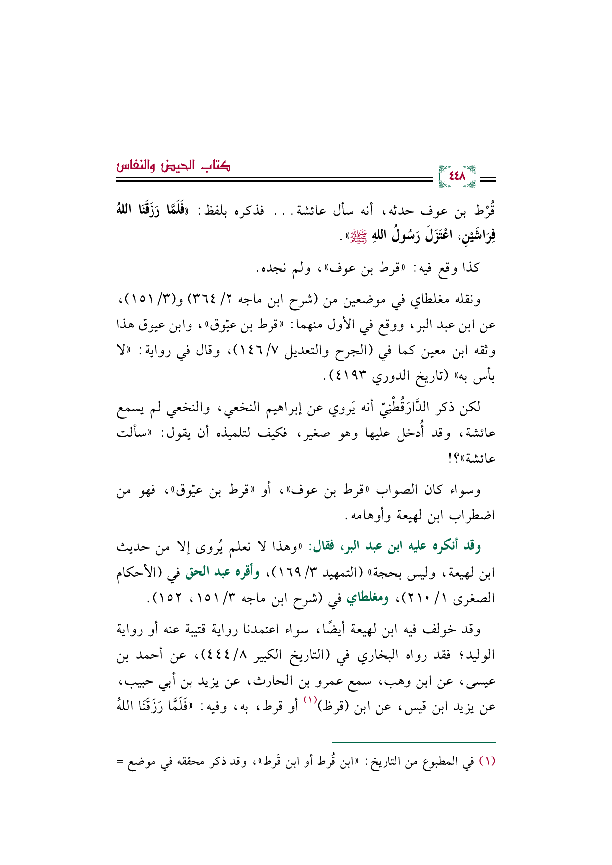 ونقله مغلطاي في موضعين من (شرح ابن ماجه ٢/ ٣٦٤) و (٣/ ١٥١)، عن ابن عبد البر، ووقع في الأول منهما: ((قرط بن عيّوق))، وابن عيوق هذا وثقه ابن معين كما في (الجرح والتعديل ٧/ ١٤٦)، وقال في رواية: ((لا بأس به)) (تاريخ الدوري ٤١٩٣).