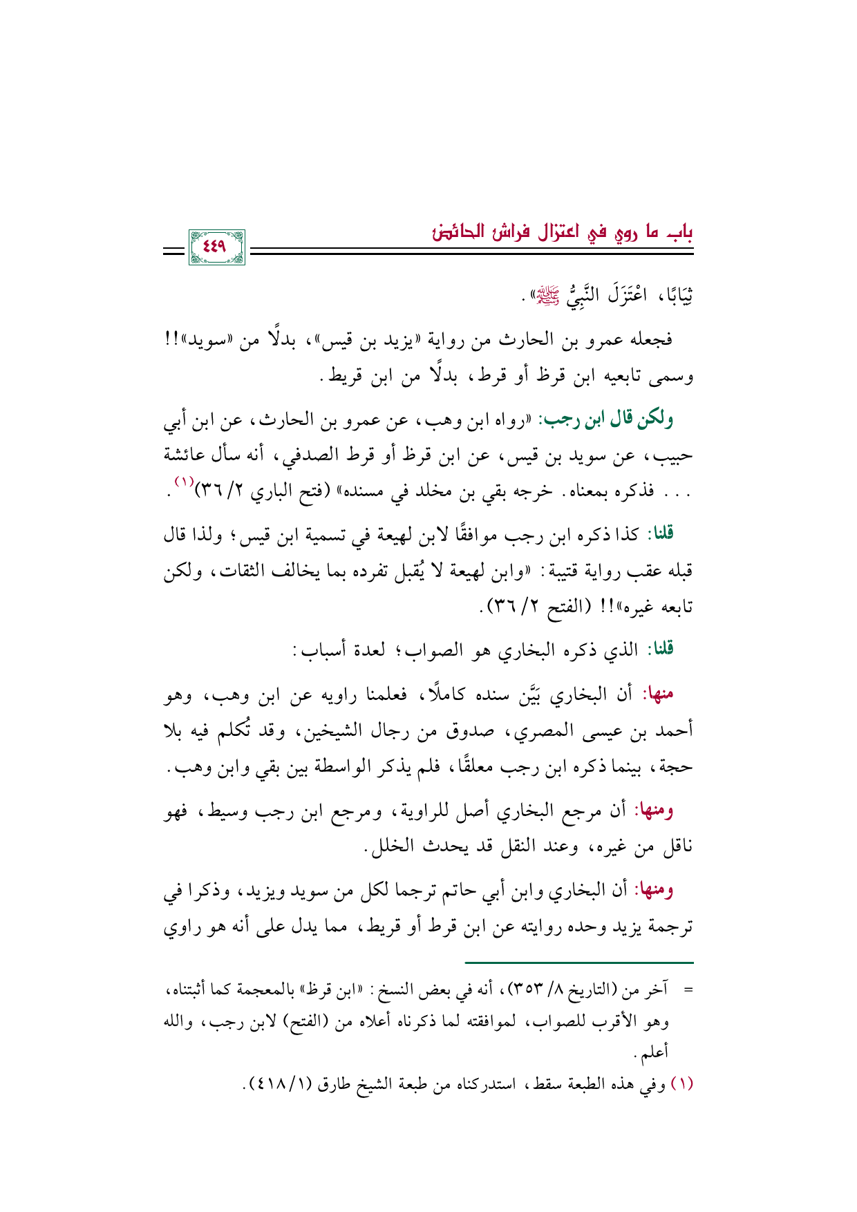 منها: أن البخاري بَيَّن سنده كاملًا، فعلمنا راويه عن ابن وهب، وهو أحمد بن عيسى المصري، صدوق من رجال الشيخين، وقد تُكلم فيه بلا حجة، بينما ذكره ابن رجب معلقًا، فلم يذكر الواسطة بين بقي وابن وهب.