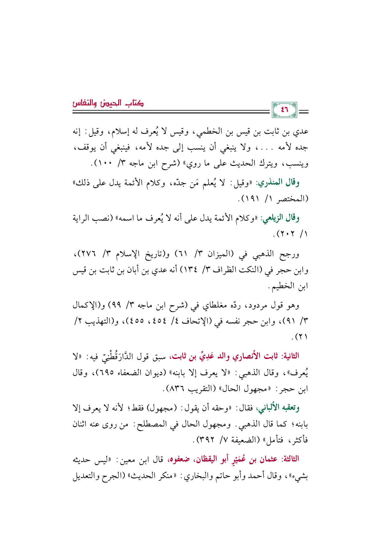 عدي بن ثابت بن قيس بن الخطمي، وقيس لا يُعرف له إسلام، وقيل: إنه جده لأمه ... ، ولا ينبغي أن ينسب إلى جده لأمه، فينبغي أن يوقف، وينسب، ويترك الحديث على ما روي)) (شرح ابن ماجه ٣/ ١٠٠).