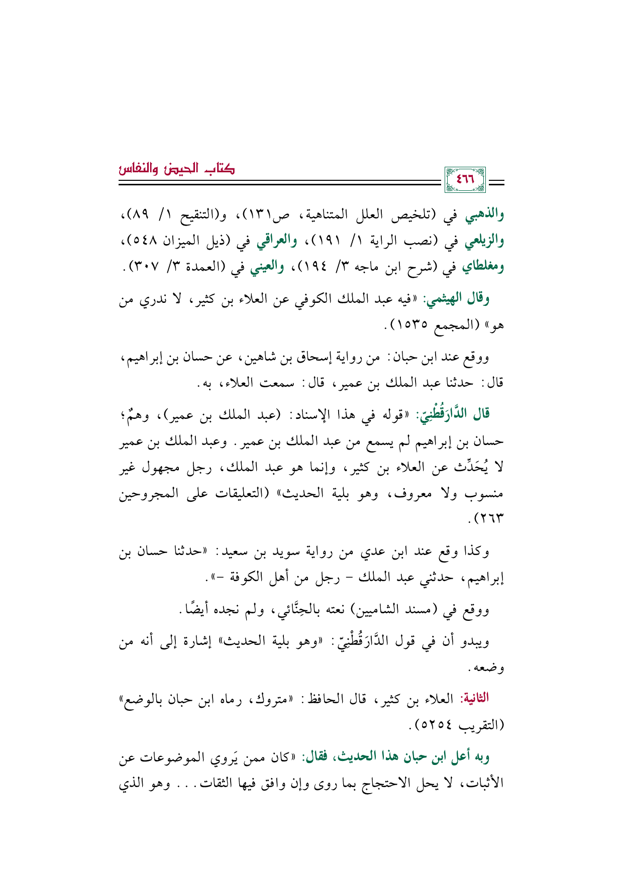 قال الدَّارَقُطْنِيّ: ((قوله في هذا الإسناد: (عبد الملك بن عمير)، وهمٌ؛ حسان بن إبراهيم لم يسمع من عبد الملك بن عمير. وعبد الملك بن عمير لا يُحَدِّث عن العلاء بن كثير، وإنما هو عبد الملك، رجل مجهول غير منسوب ولا معروف، وهو بلية الحديث)) (التعليقات على المجروحين ٢٦٣).