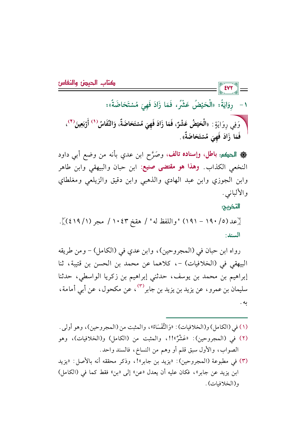 (¬٣) - في مطبوعة (المجروحين): ((يزيد بن جابر))!، وذكر محققه أنه بالأصل: ((يزيد بن يزيد عن جابر))، فكان عليه أن يعدل ((عن)) إلى ((بن)) فقط كما في (الكامل) و (الخلافيات).