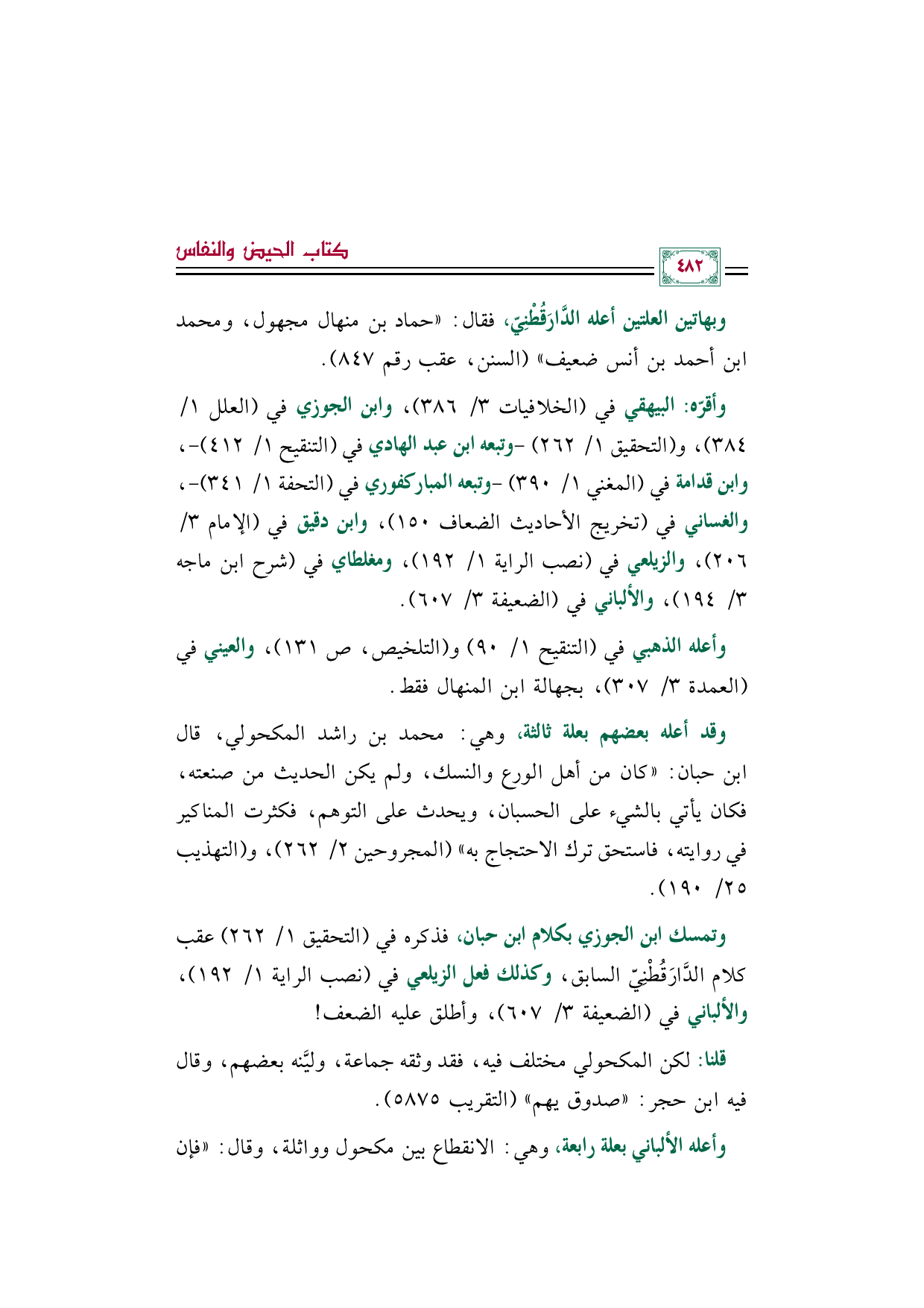 وتمسك ابن الجوزي بكلام ابن حبان، فذكره في (التحقيق ١/ ٢٦٢) عقب كلام الدَّارَقُطْنِيّ السابق، وكذلك فعل الزيلعي في (نصب الراية ١/ ١٩٢)، والألباني في (الضعيفة ٣/ ٦٠٧)، وأطلق عليه الضعف!