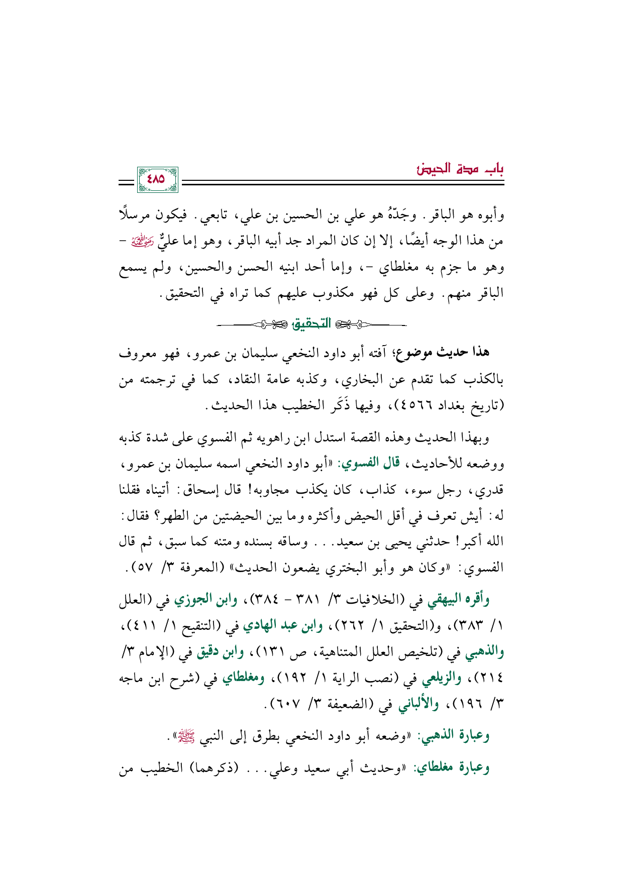 وأقره البيهقي في (الخلافيات ٣/ ٣٨١ - ٣٨٤)، وابن الجوزي في (العلل ١/ ٣٨٣)، و (التحقيق ١/ ٢٦٢)، وابن عبد الهادي في (التنقيح ١/ ٤١١)، والذهبي في (تلخيص العلل المتناهية، ص ١٣١)، وابن دقيق في (الإمام ٣/ ٢١٤)، والزيلعي في (نصب الراية ١/ ١٩٢)، ومغلطاي في (شرح ابن ماجه ٣/ ١٩٦)، والألباني في (الضعيفة ٣/ ٦٠٧).