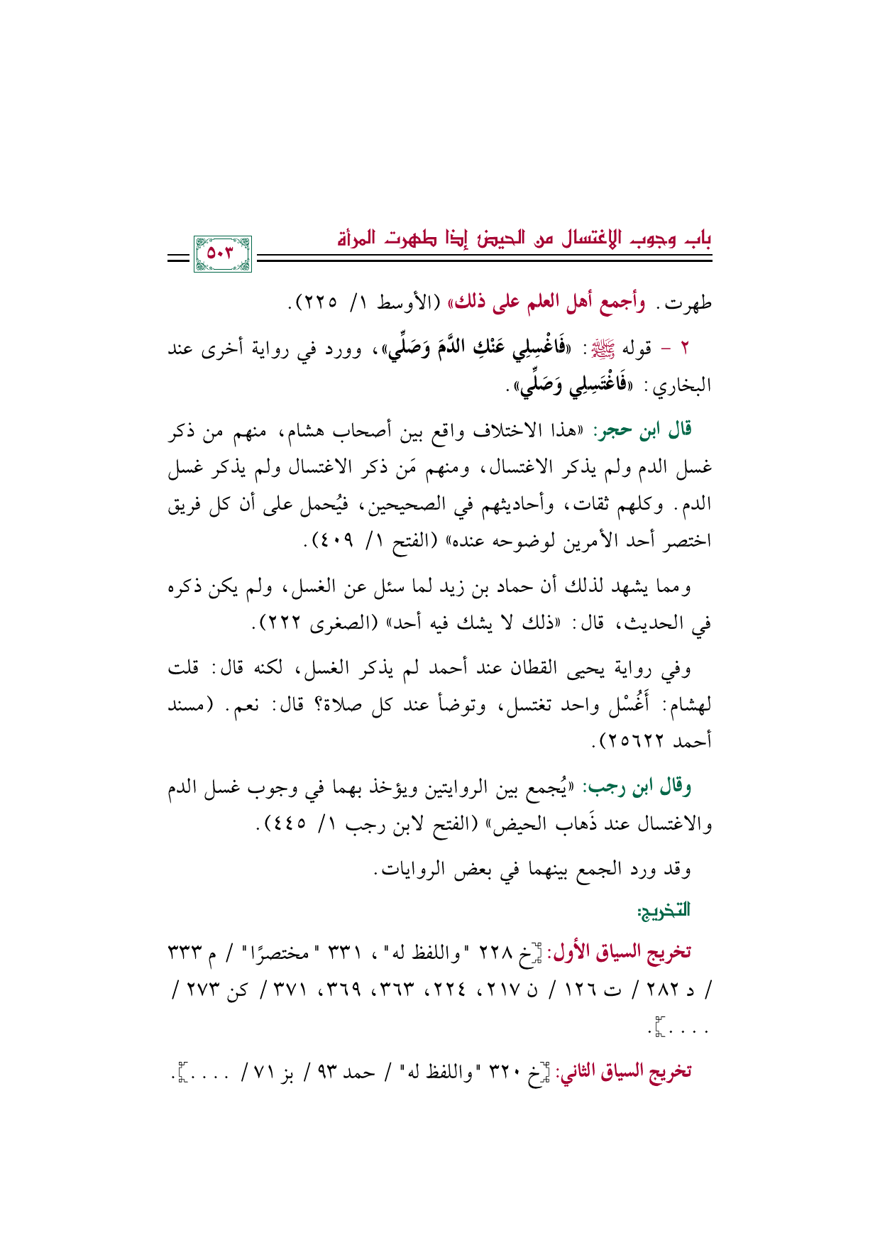 وقال ابن رجب: ((يُجمع بين الروايتين ويؤخذ بهما في وجوب غسل الدم والاغتسال عند ذَهاب الحيض)) (الفتح لابن رجب ١/ ٤٤٥).