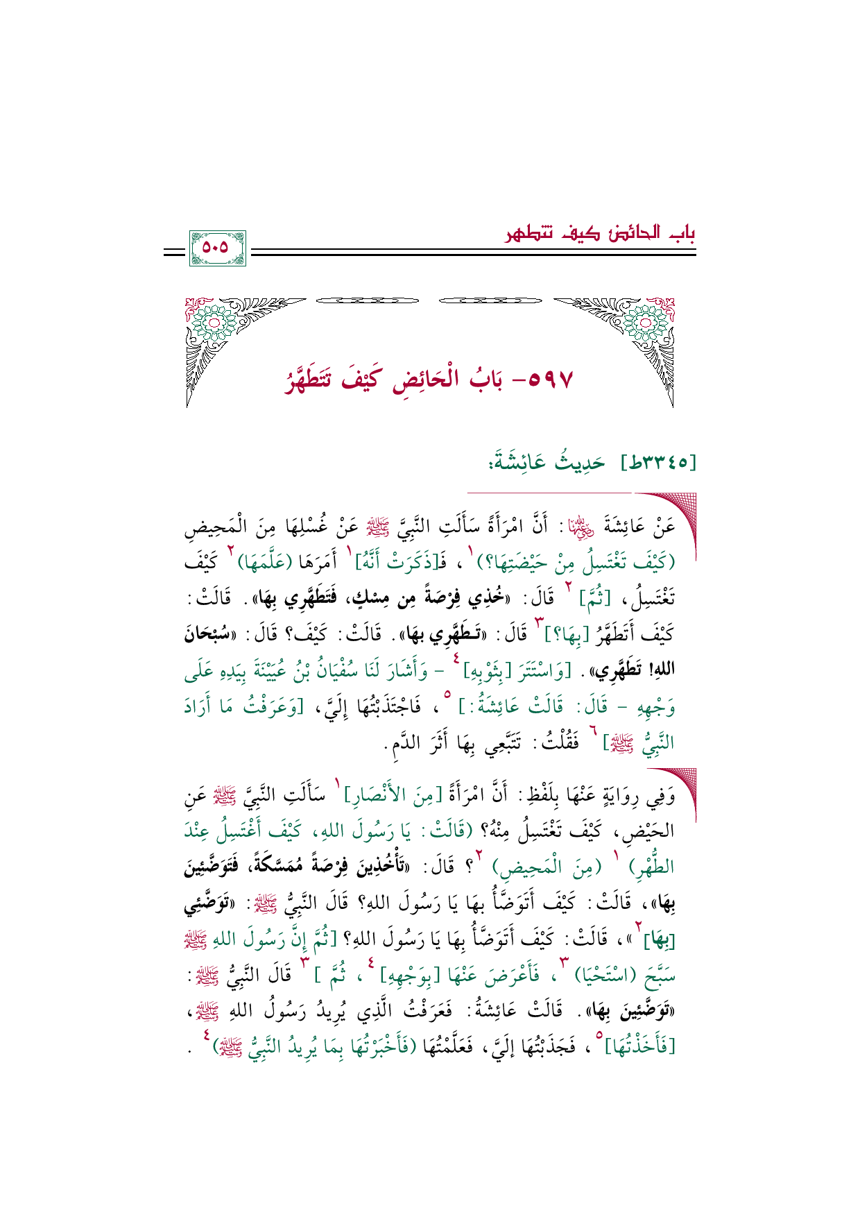 ٥٩٧ - بَابُ الْحَائِضِ كَيْفَ تَتَطَهَّرُ